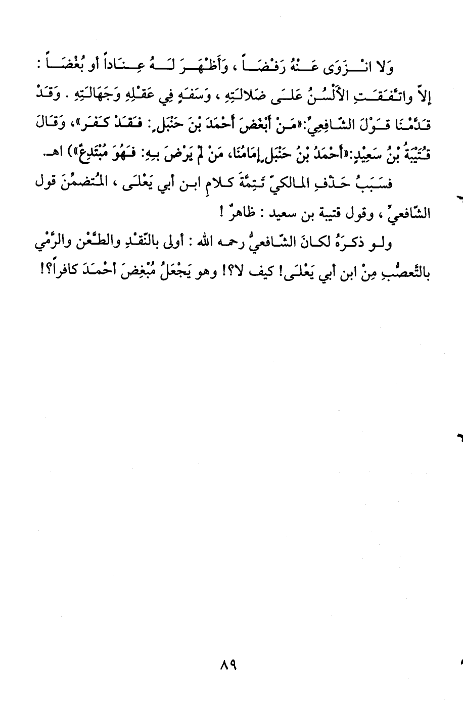 ولو ذكره لكان الشافعي رحمه الله: أولى بالنقد والطعن والرمي بالتعصب من ابن أبي يعلى! كيف لا؟! وهو يجعل مبغض أحمد كافرا؟!