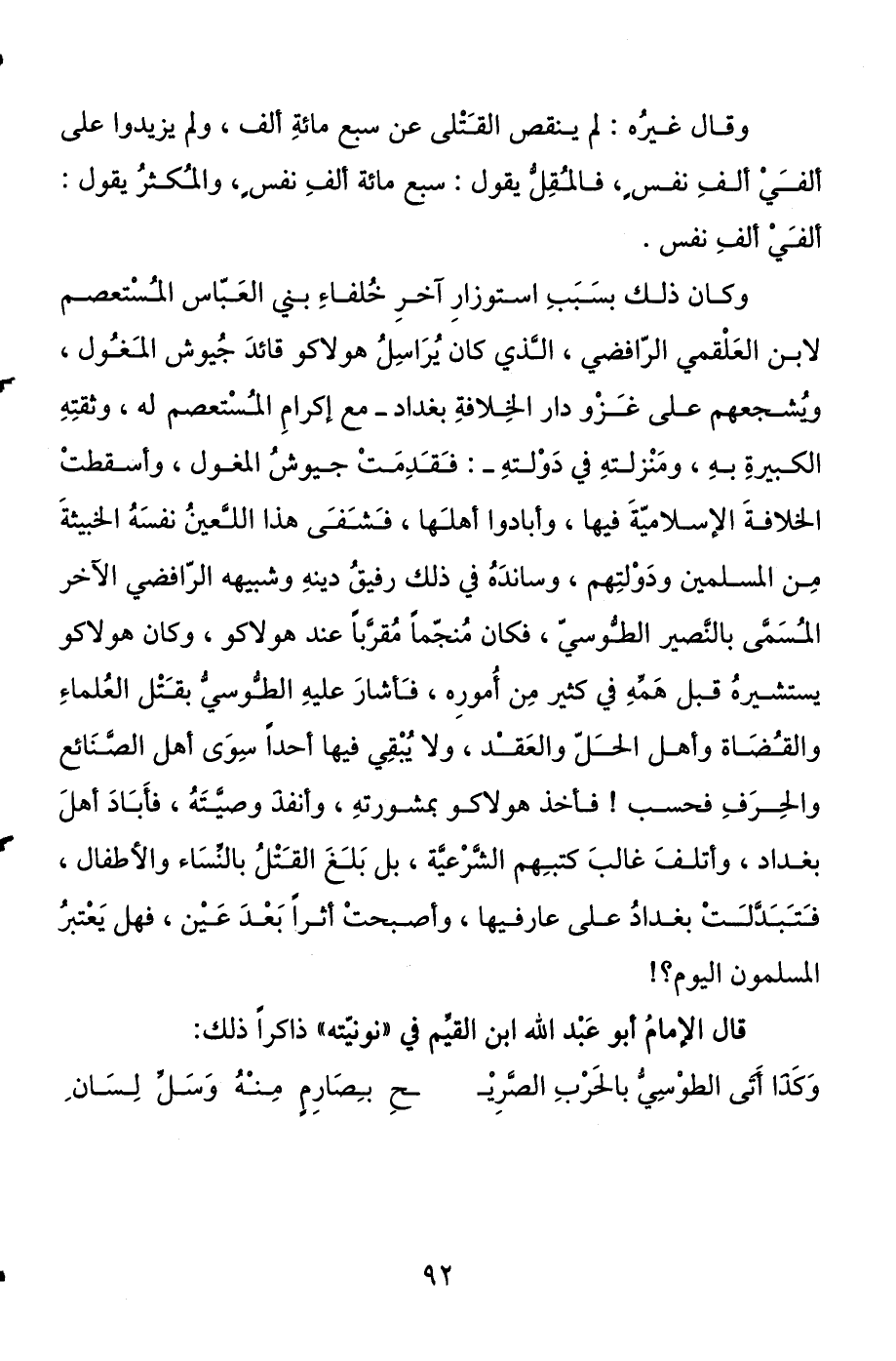وكان ذلك بسبب استوزار آخر خلفاء بني العباس المستعصم لابن العلقمي الرافضي، الذي كان يراسل هولاكو قائد جيوش المغول، ويشجعهم على غزو دار الخلافة بغداد -مع إكرام المستعصم له، وثقته الكبيرة به، ومنزلته في دولته-: فقدمت جيوش المغول، وأسقطت الخلافة الإسلامية فيها، وأبادوا أهلها، فشفى هذا اللعين نفسه الخبيثة من المسلمين ودولتهم، وسانده في ذلك رفيق دينه وشبيهه الرافضي الآخر المسمى بالنصير الطوسي، فكان منجما مقربا عند هولاكو، وكان هولاكو يستشيره قبل همه في كثير من أموره، فأشار عليه الطوسي بقتل العلماء والقضاة وأهل الحل والعقد، ولا يبقي فيها أحدا سوى أهل الصنائع والحرف فحسب! فأخذ هولاكو بمشورته، وأنفذ وصيته، فأباد أهل بغداد، وأتلف غالب كتبهم الشرعية، بل بلغ القتل بالنساء والأطفال، فتبدلت بغداد على عارفيها، وأصبحت أثرا بعد عين، فهل يعتبر المسلمون اليوم؟!