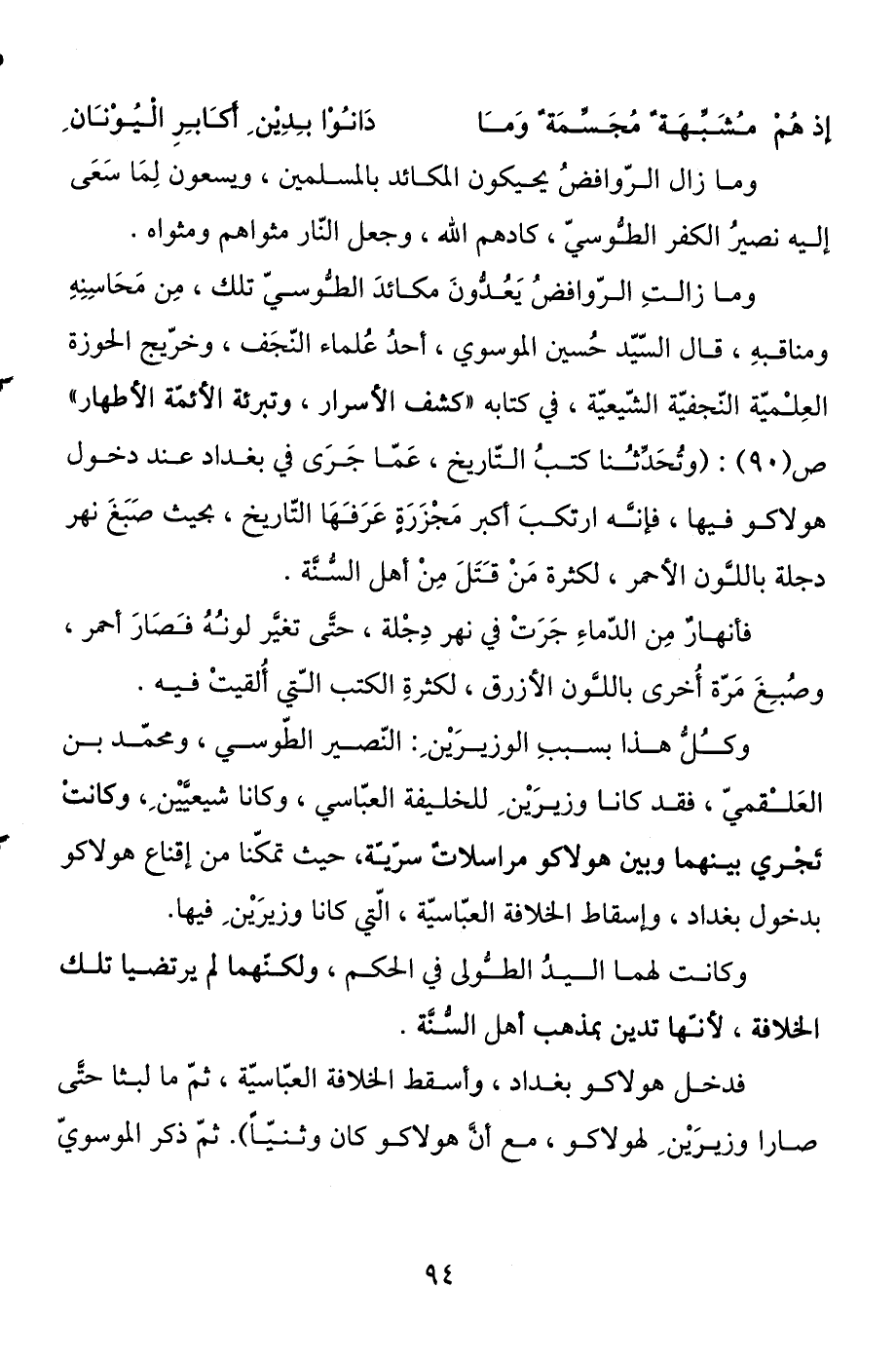 فدخل هولاكو بغداد، وأسقط الخلافة العباسية، ثم ما لبثا حتى صارا وزيرين لهولاكو، مع أن هولاكو كان وثنيا) . ثم ذكر الموسوي