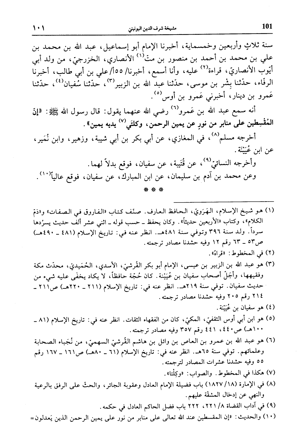 أنه سمع عبد الله بن عمرو رضي الله عنهما يقول: قال رسول الله صلى الله عليه وسلم: ((إن المقسطين على منابر من نورٍ عن يمين الرحمن، وكلتي يديه يمين)) .