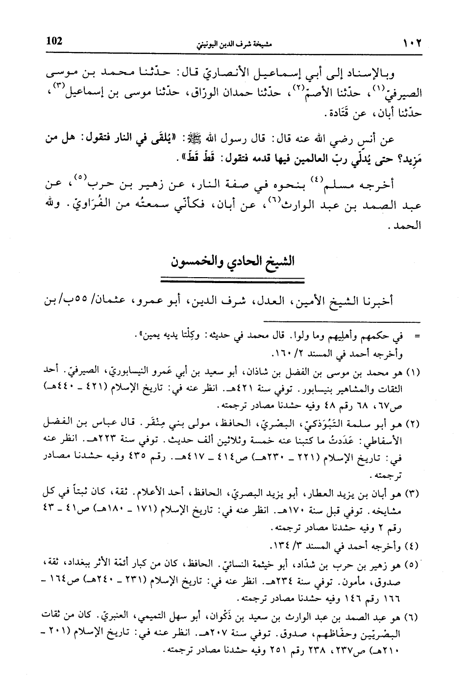 وبالإسناد إلى أبي إسماعيل الأنصاري قال: حدثنا محمد بن موسى الصيرفي، حدثنا الأصم، حدثنا حمدان الوراق، حدثنا موسى بن إسماعيل، حدثنا أبان، عن قتادة.