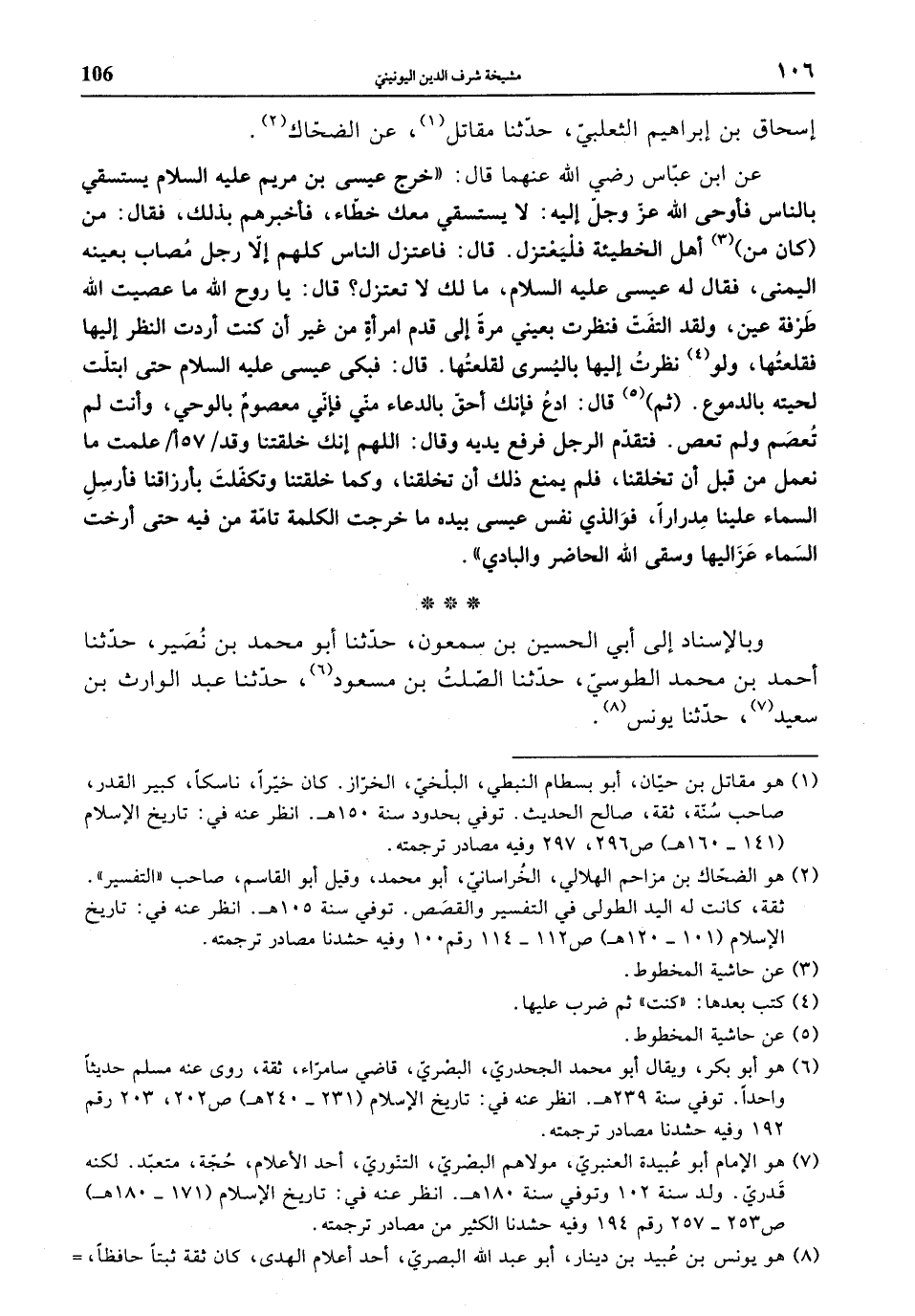 وبالإسناد إلى أبي الحسين بن سمعون، حدثنا أبو محمد بن نصير، حدثنا أحمد بن محمد الطوسي، حدثنا الصلت بن مسعود، حدثنا عبد الوارث بن سعيد، حدثنا يونس.