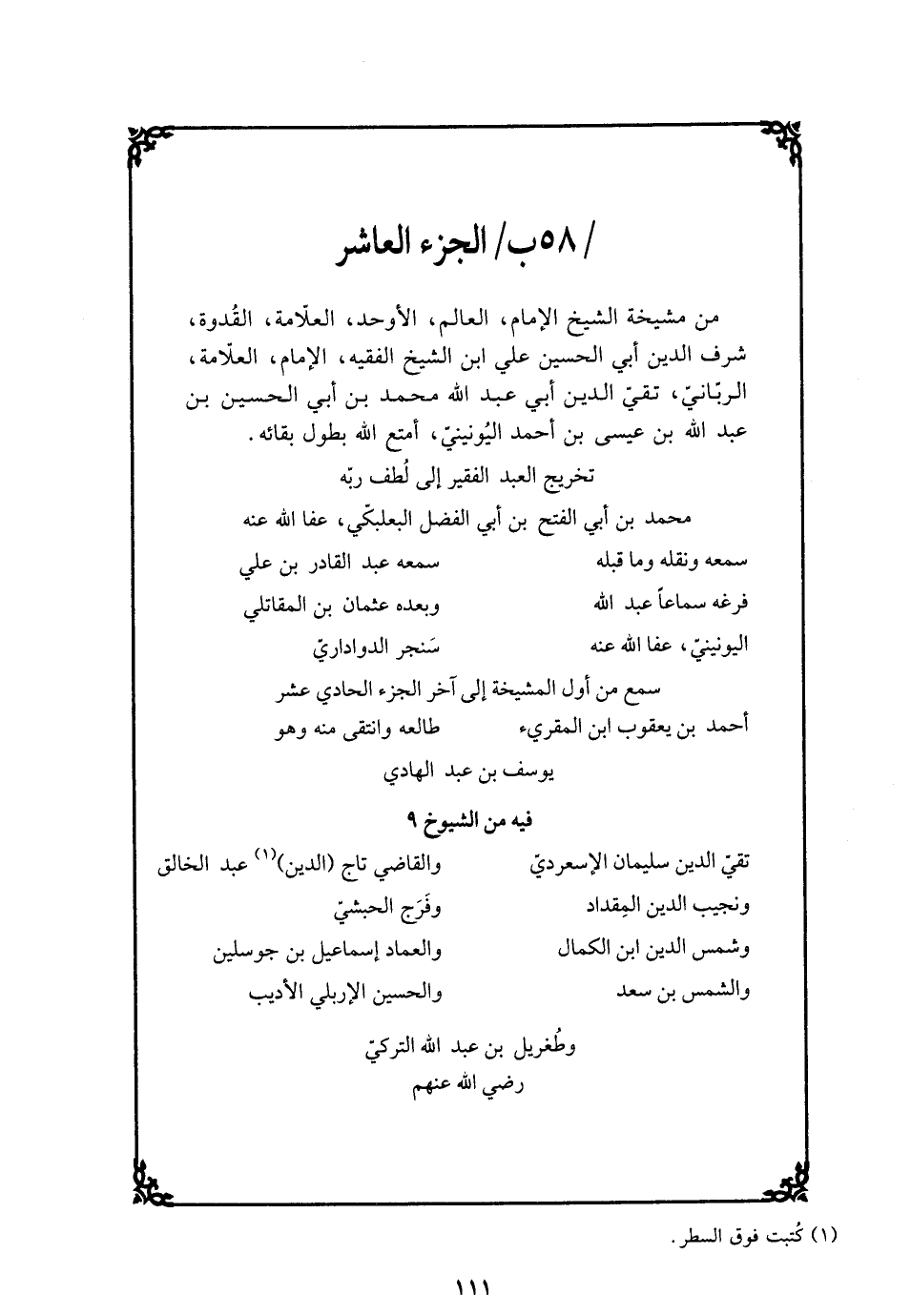 من مشيخة الشيخ الإمام، العالم، الأوحد، العلامة، القدوة، شرف الدين أبي الحسين علي بن الشيخ الفقيه الإمام، العلامة، الرباني، تقي الدين أبي عبد الله محمد بن أبي الحسين بن عبد الله بن عيسى بن أحمد اليونيني، أمتع الله تعالى بطول بقائه.