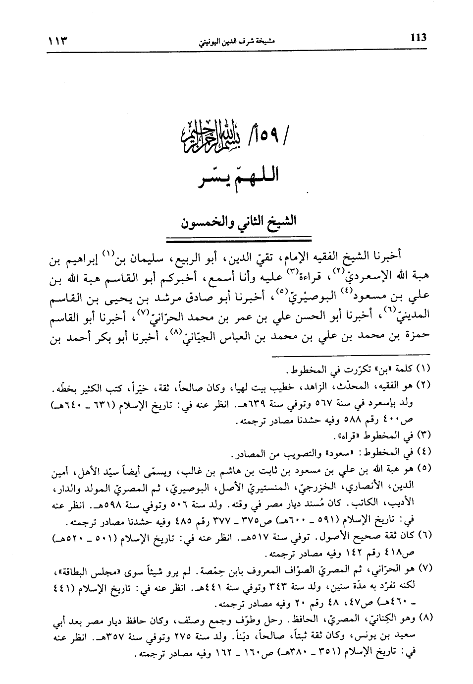 أخبرنا الشيخ الفقيه الإمام، تقي الدين، أبو الربيع، سليمان بن إبراهيم بن هبة الله الإسعردي، قراءةً عليه وأنا أسمع، أخبركم أبو القاسم هبة الله بن علي بن مسعود البوصيري، أخبرنا أبو صادق مرشد بن يحيى بن القاسم المديني، أخبرنا أبو الحسن علي بن عمر بن محمد الحراني، أخبرنا أبو القاسم حمزة بن محمد بن علي بن محمد بن العباس الجياني، أخبرنا أبو بكر أحمد بن