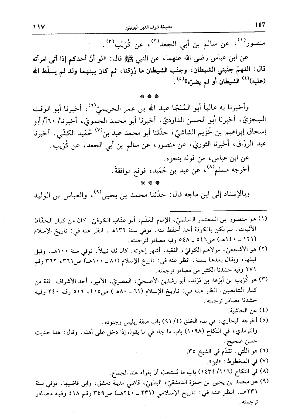 وأخبرنا به عالياً أبو المنجا عبد الله بن عمر الحريمي، أخبرنا أبو الوقت السجزي، أخبرنا أبو الحسن الداودي، أخبرنا أبو محمد الحموي، أخبرنا أبو إسحاق بن إبراهيم بن خزيم الشاشي، حدثنا أبو محمد عبد بن حميد الكشي، أخبرنا عبد الرزاق، أخبرنا الثوري، عن منصور، عن سالم بن أبي الجعد، عن كريب.