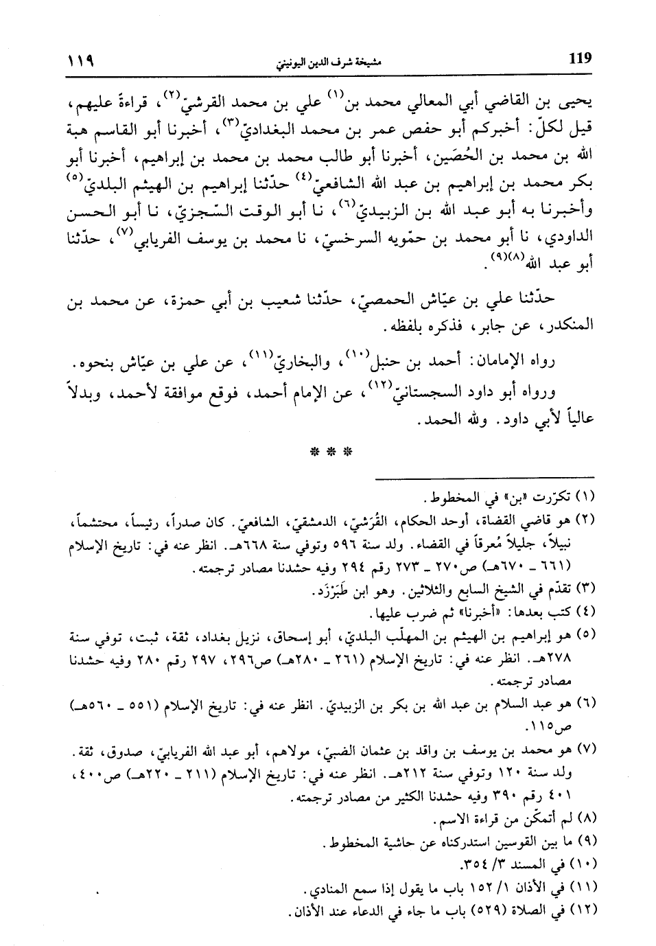 يحيى بن القاضي أبي المعالي محمد بن علي بن محمد القرشي، قراءةً عليهم، قيل لكل: أخبركم أبو حفص عمر بن محمد البغدادي، أخبرنا أبو القاسم هبة الله بن محمد بن الحصين، أخبرنا أبو طالب محمد بن محمد بن إبراهيم، أخبرنا أبو بكر محمد بن إبراهيم بن عبد الله الشافعي حدثنا إبراهيم بن الهيثم البلدي وأخبرنا به أبو عبد الله بن الزبيدي، نا أبو الوقت السجزي، نا أبو الحسن الداودي، نا أبو محمد بن حمويه السرخسي، نا محمد بن يوسف الفريابي، حدثنا أبو عبد الله.