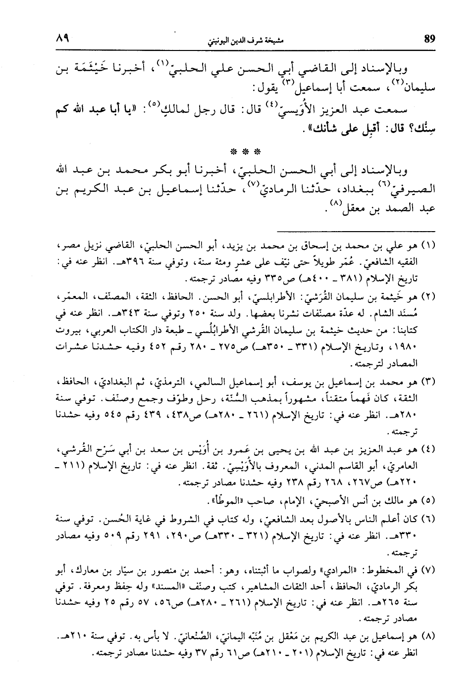 وبالإسناد إلى أبي الحسن الحلبي، أخبرنا أبو بكر محمد بن عبد الله الصيرفي ببغداد، حدثنا الرمادي، حدثنا إسماعيل بن عبد الكريم بن عبد الصمد بن معقل.