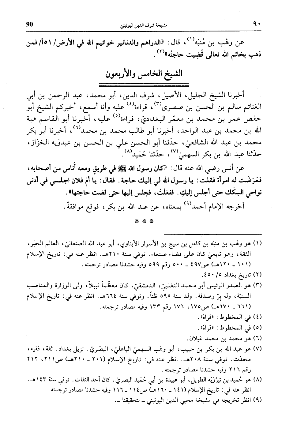 أخبرنا الشيخ الجليل، الأصيل، شرف الدين، أبو محمد، عبد الرحمن بن أبي الغنائم سالم بن الحسن بن صصرى، قراءةً عليه وأنا أسمع، أخبركم الشيخ أبو حفص عمر بن محمد بن معمر البغدادي، قراءةً عليه، أخبرنا أبو القاسم هبة الله بن محمد بن عبد الواحد، أخبرنا أبو طالب محمد بن محمد، أخبرنا أبو بكر محمد بن عبد الله الشافعي، حدثنا أبو الحسن علي بن الحسن بن عبدويه الخزاز، حدثنا عبد الله بن بكر السهمي، حدثنا حميد.