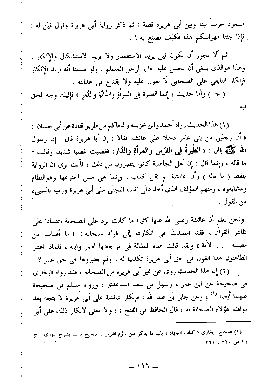 1) هذا الحديث رواه أحمد وابن خزيمة والحاكم من طريق قتادة عن أبي حسان: «أَنَّ رَجُلَيْنِ مِنْ بَنِي عَامِرٍ دَخَلاَ عَلَى عَائِشَةَ فَقَالاَ: إِنَّ أَبَا هُرَيْرَةَ قَالَ: إِنَّ رَسُولَ اللهِ - صَلََّى اللهُ عَلَيْهِ وَسَلَّمَ - قَالَ: «الطِّيَرَةُ فِي الْفَرَسِ وَالْمَرْأَةِ وَالدَّارِ» فَغَضِبَتْ غضبًا شديدًا وَقَالَتْ: مَا قَالَهُ، وَإِنَّمَا قَالَ: «إِنَّ أَهْلَ الجَاهِلِيَّةِ كَانُوا يِتَطَيَّرُونَ مِنْ ذَلِكَ»، فأنت ترى أن الرواية بلفظ (مَا قَالَهُ) وأن عائشة لم تقل كذب، وإنما هي مِمَّنْ اخترعها وهو النَظَّامُ ومشايعوه، ومنهم المؤلف الذي أخذ على نفسه التَجَنِّي على أبي هريرة ورميه بِالسَّيِّءِ من القول.