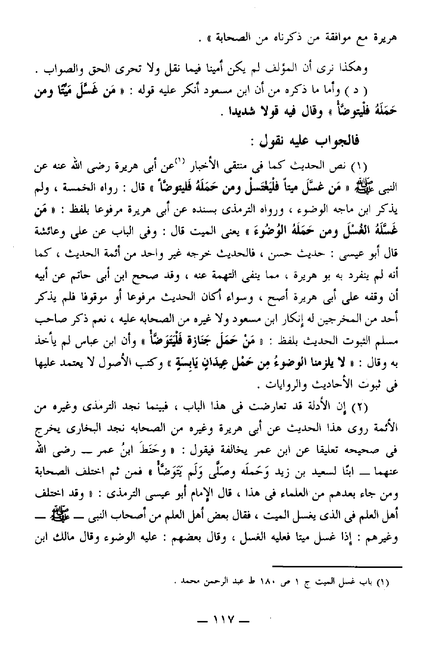1 - نص الحديث كما في " منتقى الأخبار " (¬1) عن أبي هريرة - رَضِيَ اللهُ عَنْهُ - عن النَّبِي - صَلََّى اللهُ عَلَيْهِ وَسَلَّمَ -: «مَنْ غَسَّلَ مَيِّتًا فَلْيَغْتَسِلْ، وَمَنْ حَمَلَهُ فَلْيَتَوَضَّأْ» قال: رواه الخمسة، ولم يذكر ابن ماجه الوضوء، ورواه الترمذي بسنده عن أبي هريرة مرفوعًا بلفظ: «مِنْ غُسْلِهِ الغُسْلُ، وَمِنْ حَمْلِهِ الوُضُوءُ» يعني الميت قال: وفي الباب عن علي وعائشة قال أبو عيسى: حديث حسن، فالحديث خَرَّجَهُ غير واحد من أئمة الحديث، كما أنه لم ينفرد به أبو هريرة، مِمَّا ينفي التهمة عنه، وقد صَحَّحَ ابن أبي حاتم عن أبيه أن وقفه على أبي هريرة أصح، وسواء أكان الحديث مرفوعًا أو موقوفًا فلم يذكر أحد من المُخَرِّجِينَ له إنكار ابن مسعود ولا غيره من الصحابة عليه، نعم ذكر صاحب " مسلم الثبوت " الحديث بلفظ: «مَنْ حَمَلَ جَنَازَةً فَلْيَتَوَضَّأْ» وأن ابن عباس لم يأخذ به وقال: «لاَ يَلْزَمُنَا الوُضُوءُ مِنْ حَمْلِ عِيدَانٍ يَابِسَةٍ» وكتب الأصول لا يعتمد عليها في ثبوت الأحاديث والروايات.