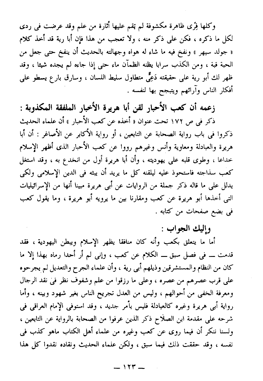 أما ما يتعلق بكعب وأنه كان منافقًا يظهر الإسلام ويبطن اليهودية، فقد قدمت - في فصل سبق - الكلام عن كعب، وإني لَمْ أَرَ أَحَدًا رماه بهذا إِلاَّ ما كان من النَظَّامِ وَالمُسْتَشْرِقِينَ وذيلهم أَبِي رَيَّةَ، وأن علماء الجرح والتعديل لَمْ يُجَرِّحُوهُ على قرب عصرهم من عصره، وعلى ما رزقوا من علم وشفوف نظر في نقد الرجال ومعرفة الخفي من أحوالهم، وليس من العدل تجريح الناس بغير شُهُودٍ وَبَيِّنَةٍ، وأما رواية أبي هريرة وغيره كالعبادلة فليس بأمر جديد، وقد استوفى الإمام العراقي في " شرحه على مقدمة ابن الصلاح " ذكر الذين عرفوا من الصحابة بالرواية عن التابعين، ولسنا ننكر أن فيما روي عن كعب وغيره من علماء أهل الكتاب ما هو كذب في نفسه، وقد حَقَّقْتُ ذلك فيما سبق، ولكن علماء الحديث وَنُقَّادُهُ نقدوا كل هذا