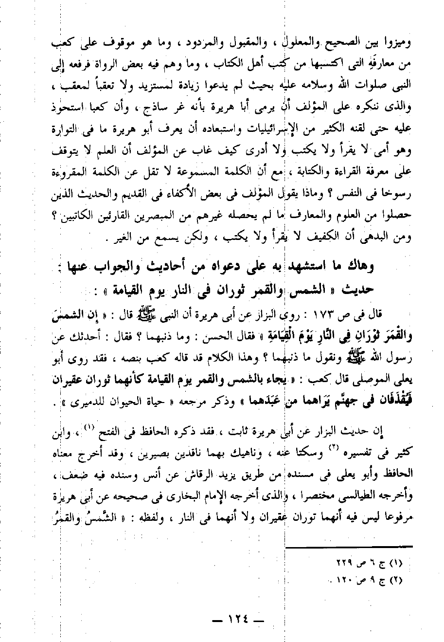 قال في [ص 173]: روى البزار عن أبي هريرة أن النَّبِي - صَلََّى اللهُ عَلَيْهِ وَسَلَّمَ - قال: «إنَّ الشَّمْسَ وَالْقَمَرَ ثَوْرَانِ فِي النَّارِ يَوْمَ الْقِيَامَةِ» فَقَالَ الحَسَنُ: " وَمَا ذَنْبَهُمَا؟ " فَقَالَ: " أُحَدِّثُكَ عَنْ رَسُولِ اللهِ - صَلََّى اللهُ عَلَيْهِ وَسَلَّمَ - وَتَقُولُ مَا ذَنْبَهُمَا؟ " وهذا الكلام قد قاله كعب بنصه، فقد روى أبو يعلى الموصلي قال كعب: «يُجَاءُ بِالشَّمْسِ وَالقَمَرِ يَوْمَ القِيَامَةِ كَأَنَّهُمَا ثَوْرَانِ عَقِيرَانِ فَيُقْذَفَانِ فِي جَهَنَّمَ يَرَاهُمَا مَنْ عَبَدَهُمَا» وذكر مرجعه " حياة الحيوان " للدميري.