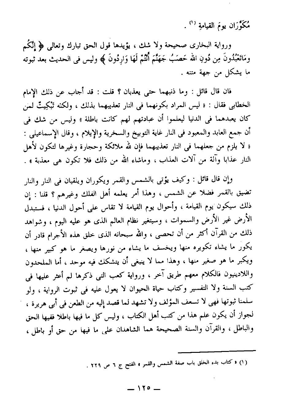 وإن قال قائل: وكيف يؤتى بالشمس والقمر ويكوران ويلقيان في النار والنار تضيق بالقمر فضلا عن الشمس، وهذا أمر يعلمه أهل الفلك وغيرهم؟ قلنا: إن ذلك سيكون يوم القيامة، وأحوال يوم القيامة لا تقاس على أحوال الدنيا، فستبدل الأرض غير الأرض والسماوات، وسيتغير نظام العالم الذي هو عليه اليوم، وشواهد ذلك من القرآن أكثر من أن تحصى، والله سبحانه الذي خلق هذه الأجرام قادر أن يُكَوِّرَ ما يشاء تكويره منها ويخسف ما يشاء من نورها وَيُصَغِّرَ ما هو كبير منها، ويكبر ما هو صغير منها، وهذا مِمَّا لا ينبغي أن يتشكك فيه مُوَحِّدٌ، أما الملحدون واللادينيون فللكلام معهم طريق آخر، ورواية كعب التي ذكرها لم أعثر عليها في كُتُبِ السُنَّةِ ولا التفسير وكتاب " حياة الحيوان " لاَ يُعَوَّلُ عليه في ثبوت الرواية، ولو سلمنا ثبوتها فهي لا تسعف المؤلف ولا تشهد لما قصد إليه من الطعن في أبي هريرة، لجواز أن يكون علم هذا من كتب أهل الكتاب، وليس كل ما فيها باطلاً ففيها الحق والباطل، والقرآن وَالسُنَّةُ الصحيحة هما الشاهدان على ما فيها من حق أو باطل