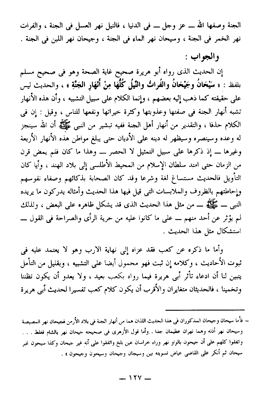 إنَّ الحديث الذي رواه أبو هريرة صحيح غاية الصحة وهو في " صحيح مسلم " بلفظ: «سَيْحَانُ وَجَيْحَانُ وَالفُرَاتُ وَالنِّيلُ كُلُّهَا مِنْ أَنْهَارِ الْجَنَّةِ»، والحديث ليس على حقيقته كما ذهب إليه بعضهم، وإنما الكلام على سبيل التشبيه، وأن هذه الأنهار تشبه أنهار الجنة في صفتها وعذوبتها وكثرة خيراتها ونفعها للناس، وقيل: إن في الكلام حَذْفًا، والتقدير من أنهار أهل الجنة ففيه تبشير من النَّبِيِّ - صَلََّى اللهُ عَلَيْهِ وَسَلَّمَ - أن الله سينجز له وعده وسينصره وسيظهر له دينه على الأديان حتى يبلغ مواطن هذه الأنهار الأربعة وغيرها - إذ ذكرها على سبيل التمثيل لا الحصر - وهذا ما كان فلم يمض قرن من الزمان حتى امتد سلطان الإسلام من المحيط الأطلسي إلى بلاد الهند، وأيا كان التأويل فالحديث مستساغ لغة وشرعًا وقد كان الصحابة بذكائهم وصفاء نفوسهم وإحاطتهم بالظروف والملابسات التي قيل فيها هذا الحديث وأمثاله يدركون ما يريده النَّبِيُّ - صَلََّى اللهُ عَلَيْهِ وَسَلَّمَ - من مثل هذا الحديث الذي قد يشكل ظاهره على البعض، ولذلك لم يؤثر عن أحد منهم - على ما كانوا عليه من حُرِيَّةَ الرأي والصراحة في القول استشكال مثل هذا الحديث.