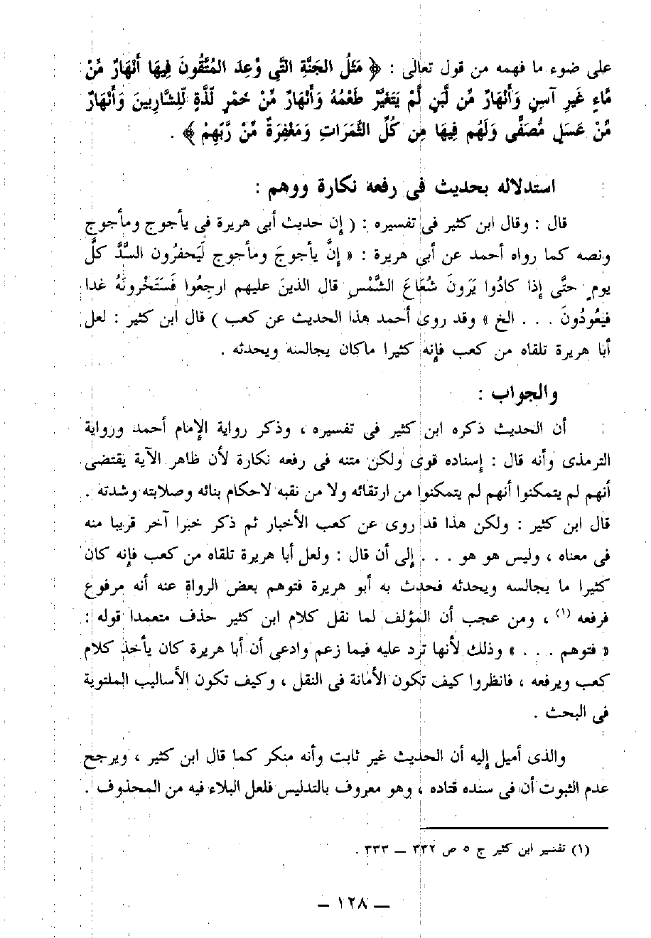 قال: وقال ابن كثير في " تفسيره ": «إن حديث أبي هريرة في يأجوج ومأجوج ونصه كما رواه أحمد عن أبي هريرة: «إِنَّ يَأْجُوجَ وَمَأْجُوجَ لَيَحْفِرُونَ السَّدَّ كُلَّ يَوْمٍ، حَتَّى إِذَا كَادُوا يَرَوْنَ شُعَاعَ الشَّمْسِ، قَالَ الَّذِي عَلَيْهِمْ: ارْجِعُوا فَسَتَحْفِرُونَهُ غَدًا، فَيَعُودُونَ ... إلخ» وقد روى أحمد هذا الحديث عن كعب) قال ابن كثير: لعل أبا هريرة تلقاه من كعب فإنه كثيرًا ما كان يجالسه ويُحَدِّثُه.