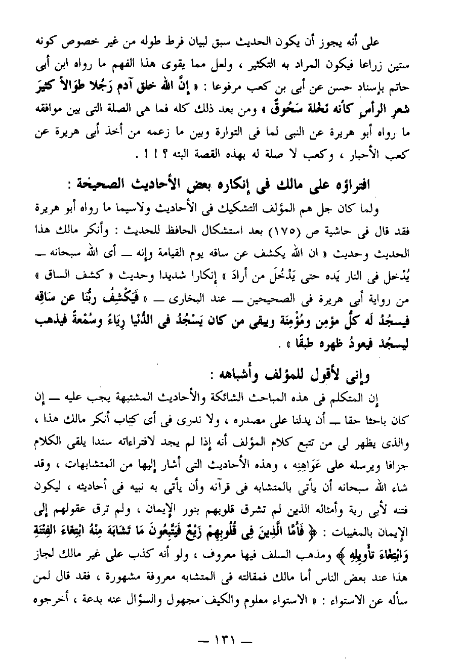 (*) جاء في " التمهيد " لابن عبد البر: عن ابن القاسم قال: «سألت مالكًا عَمَّنْ يُحَدِّثُ الحَدِيثَ " إِنَّ اللَّهَ خَلَقَ آدَمَ على وصورته " وَالحَدِيثَ " إِنَّ اللَّهَ يَكْشِفُ عَنْ سَاقِهِ يَوْمَ الْقِيَامَةِ وَإِنَّهُ يُدْخِلُ فِي النَّارِ يَدَهُ حَتَّى يُخْرِجَ مَنْ أَرَادَ " فَأَنْكَرَ ذَلِكَ إِنْكَارًا شَدِيدًا وَنَهَى أَنْ يُحَدِّثَ بِهِ أَحَدًا وَإِنَّمَا كَرِهَ ذلك مالك خَشْيَةَ الخَوْضِ فِي التَّشْبِيهِ بِكَيْفٍ هَا هُنَا». " التمهيد " لابن عبد البر، تحقيق مصطفى بن أحمد العلوي ومحمد عبد الكبير البكري، سَنَةَ 1387 هـ، نشر وزارة عموم الأوقاف والشؤون الإسلامية - المغرب.