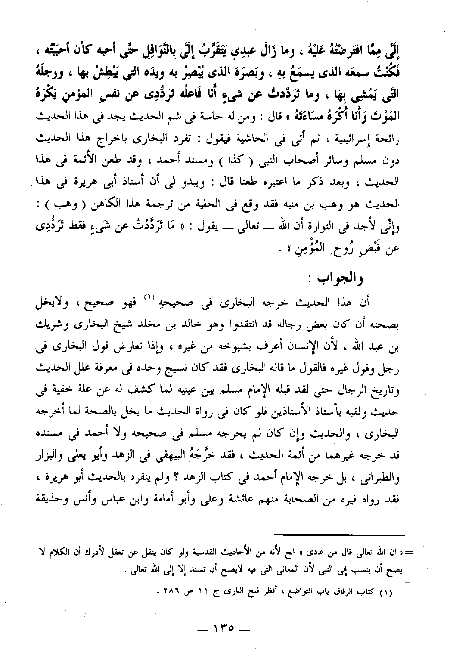 إِلَيَّ مِمَّا افْتَرَضْتُ عَلَيْهِ، وَمَا يَزَالُ عَبْدِي يَتَقَرَّبُ إِلَيَّ بِالنَّوَافِلِ حَتَّى أُحِبَّهُ، فَإِذَا أَحْبَبْتُهُ: كُنْتُ سَمْعَهُ الَّذِي يَسْمَعُ بِهِ، وَبَصَرَهُ الَّذِي يُبْصِرُ بِهِ، وَيَدَهُ الَّتِي يَبْطِشُ بِهَا، وَرِجْلَهُ الَّتِي يَمْشِي بِهَا، [وَإِنْ سَأَلَنِي لأُعْطِيَنَّهُ، وَلَئِنِ اسْتَعَاذَنِي لأُعِيذَنَّهُ]، وَمَا تَرَدَّدْتُ عَنْ شَيْءٍ أَنَا فَاعِلُهُ تَرَدُّدِي عَنْ نَفْسِ المُؤْمِنِ، يَكْرَهُ المَوْتَ وَأَنَا أَكْرَهُ مَسَاءَتَهُ». قال: ومن له حاسة في شم الحديث يجد في هذا الحديث رائحة إسرائيلية، ثم أتى في الحاشية فيقول: تفرد " البخاري " بإخراج هذا الحديث دون " مسلم " وسائر أصحاب النَّبِيِّ (كذا) و" مسند أحمد "، وقد طعن الأئمة في هذا الحديث، وبعد ذكر ما اعتبره طعنًا قال: ويبدو لي أنَّ أستاذ أبي هريرة في هذا الحديث هو وهب بن منبه فقد وقع في " الحِلْيَةِ " من ترجمة هذا الكاهن (وهب): وإني لأجد في التوراة أن الله تعالى يقول: «مَا تَرَدَّدْتُ عَنْ شَيْءٍ قَطُّ تَرَدُّدِي عَنْ قَبْضِ رُوحِ الْمُؤْمِنِ».