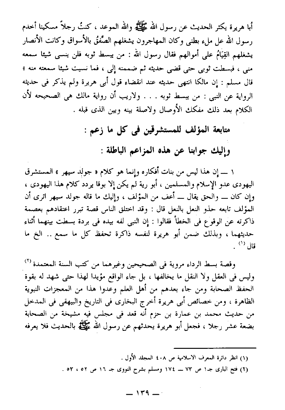 1 - إن هذا ليس من بنات أفكاره وإنما هو كلام «جولدتسيهر» المستشرق اليهودي عدو الإسلام والمسلمين، أَبُو رَيَّةَ لم يكن إِلاَّ بوقاً يُرَدِّدُ كلام هذا اليهودي، وإنْ كان - والحق يقال - أَعَفَّ من المؤلف، وإليك ما قاله جولدتسيهر لترى أنَّ المؤلف تابعه حذو النعل بالنعل قال: وقد اختلق الناس قصة تُبَرِّرُ اعتقادهم بعصمة ذاكرته عن الوقوع في الخطأ فقالوا: إنَّ النَّبِي لفه بيده في بُرْدَةٍ بسطت بينهما أثناء حديثهما، وبذلك ضمن أبو هريرة لنفسه ذاكرة تحفظ كل ما سمع ... إلخ ما قال (¬1).