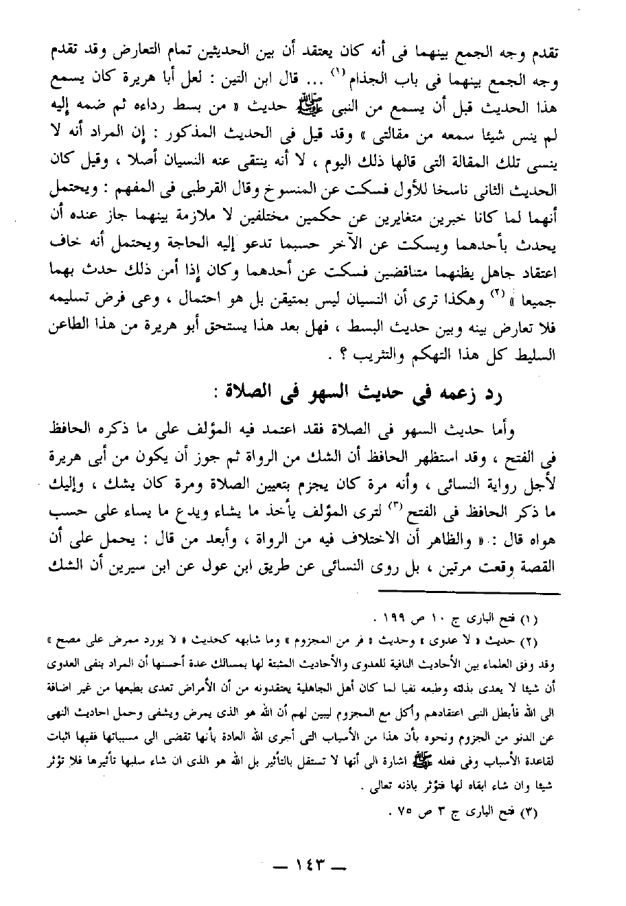 وأما حديث السهو في الصلاة فقد اعتمد فيه المؤلف على ما ذكره الحافظ في " الفتح "، وقد استظهر الحافظ أن الشك من الرواة ثم جواز أن يكون من أبي هريرة لأجل رواية النسائي، وأنه مرة كان يجزم بتعيين الصلاة وَمَرَّةً كان يشك، وإليك ما ذكر الحافظ في " الفتح " (¬3) لترى المؤلف يأخذ ما يشاء ويدع ما يشاء على حسب هواه قال: «وَالظَّاهِر أَنَّ الاِخْتِلاَفَ فِيهِ مِنَ الرُّوَاةِ. وَأَبْعَدَ مَنْ قَالَ: يُحْمَلُ عَلَى أَنَّ القِصَّةَ وَقَعَتْ مَرَّتَيْنِ، بَلْ رَوَى النَّسَائِيُّ مِنْ طَرِيقِ اِبْنِ عَوْنٍ عَنْ اِبْنِ سِيرِينَ أَنَّ اَلشَّكَّ