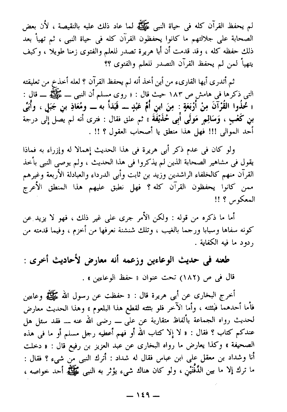 ثم أتدري أيها القارئ من أين أخذ أنه لم يحفظ القرآن؟ لعله أخذه من تعليقته التي ذكرها في [هامش ص 183] حيث قال: «روى مسلم أن النبي - صَلََّى اللهُ عَلَيْهِ وَسَلَّمَ - قال: «خذوا القرآن من أربعة: من ابن أم عبد فبدأ به، ومعاذ بن جبل، وأبي بن كعب، وسالم مولى أبي حذيفة» ثم علق فقال: فترى أنه لم يصل إلى درجة أحد الموالي!!! فهل هذا منطق يا أصحاب العقول؟!!.