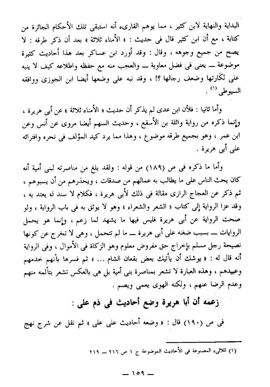 وأما ما ذكره في [ص 189] من قوله: ولقد بلغ من مناصرته لبني أمية أنه كان يحث الناس على ما يطالب به عمالهم من صدقات، ويحذرهم من أن يسبوهم، ثم ذكر عن العجاج الرازي مقالة في ذلك لأبي هريرة، فكلام لا سند له يعتد به، وقد عزا الرواية إلى كتاب " الشعر والشعراء " وهو لا يوثق به في باب الرواية، ولو صحت الرواية عن أبي هريرة فليس فيها ما يشهد لما زعم، وإنما هو يحمل الروايات - بسبب ضغنه على أبي هريرة - ما لم تتحمل، وهي لا تخرج عن كونها نصيحة رجل مسلم بإخراج حق مفروض معلوم وهو الزكاة في الأموال، وفي الرواية أنه قال له: «يُوشِكُ أَنْ يَأْتِيكَ بَعْضُ بُقْعَانِ الشَّامِ ... » ثم فسرها بأنهم خدمهم وعبيدهم، وهذه العبارة لا تشعر بمناصرة بني أمية بل هي بالعكس تشعر بتألمه منهم وعدم الرضا عنهم، ولكنه الهوى يُعْمِي وَيُصِمُّ.