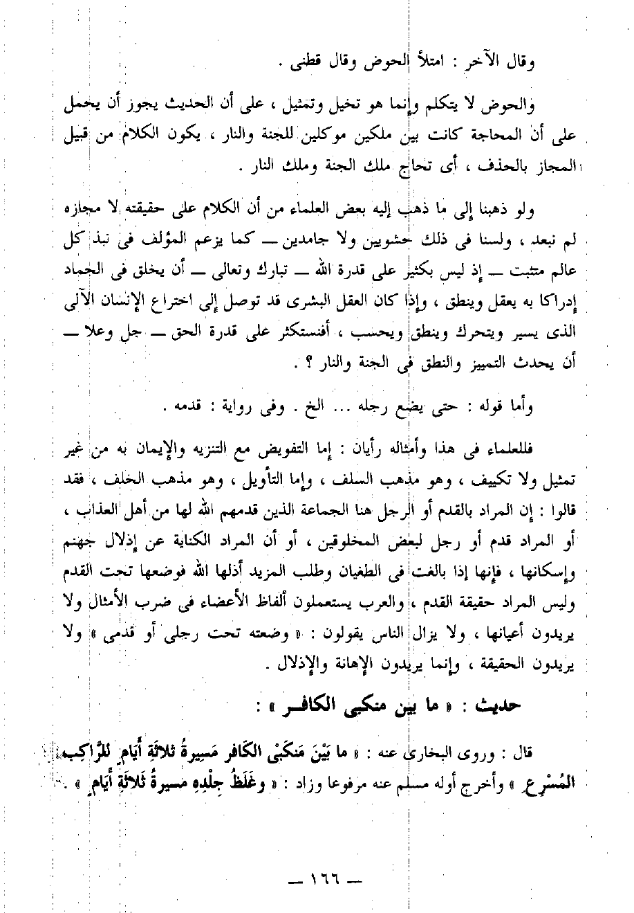 ولو ذهبنا إلى ما ذهب إليه بعض العلماء من أن الكلام على حقيقته لا مجازه لم نبعد، ولسنا في ذلك حشويين ولا جامدين - كما يزعم المؤلف في نبذ كل عالم متثبت - إذ ليس بكثير على قدرة الله - تَبَارَكَ وَتَعَالَى - أن يخلق في الجماد إدراكًا به يعقل وينطق، وإذا كان العقل البشري قد توصل إلى اختراع الإنسان الآلي الذي يسير ويتحرك وينطق ويحسب، أفنستكثر على قدرة الحق - جَلَّ وَعَلاَ - أن يُحَدِّثُ التمييز والنطق في الجنة والنار؟