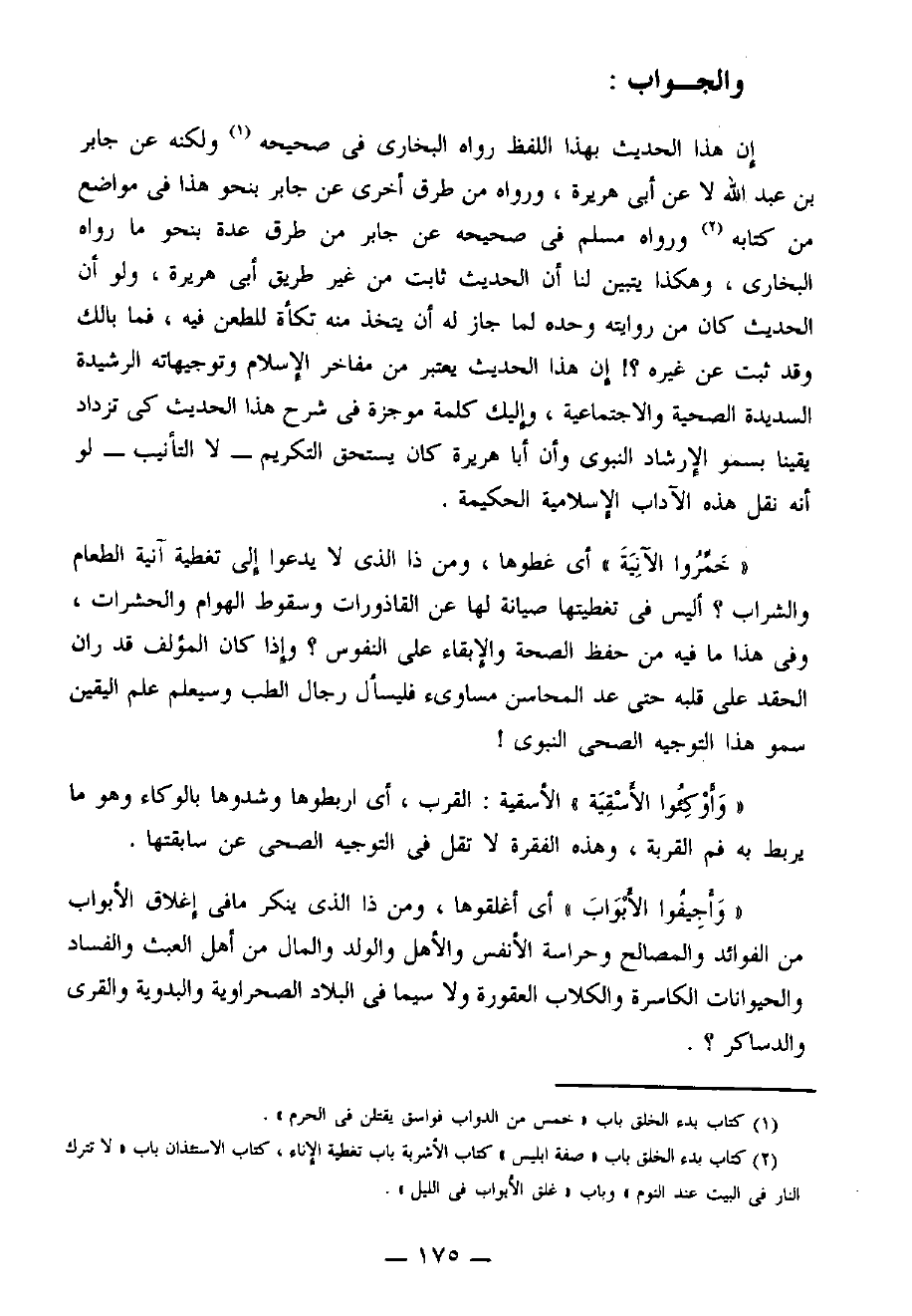 إن هذا الحديث بهذا اللفظ رواه البخاري في " صحيحه " (¬1) ولكنه عن جابر بن عبد الله لا عن أبي هريرة، ورواه من طرق أخرى عن جابر بنحو هذا في مواضع من كتابه (¬2) ورواه مسلم في " صحيحه " عن جابر من طرق عدة بنحو ما رواه البخاري، وهكذا يَتَبَيَّنُ لنا أن الحديث ثابت من غير طريق أبي هريرة، ولو أن الحديث كان من روايته وحده لما جاز له أن يتخذ منه تكأة للطعن فيه، فما بالك وقد ثبت عن غيره؟! إن هذا الحديث يعتبر من مفاخر الإسلام وتوجيهاته الرشيدة السديدة الصحية والاجتماعية، وإليك كلمة موجزة في شرح هذا الحديث كي تزداد يقينًا بسمو الإرشاد النبوي وأن أبا هريرة كان يستحق التكريم - لا التأنيب - لو أنه نقل هذه الآداب الإسلامية الحكيمة.