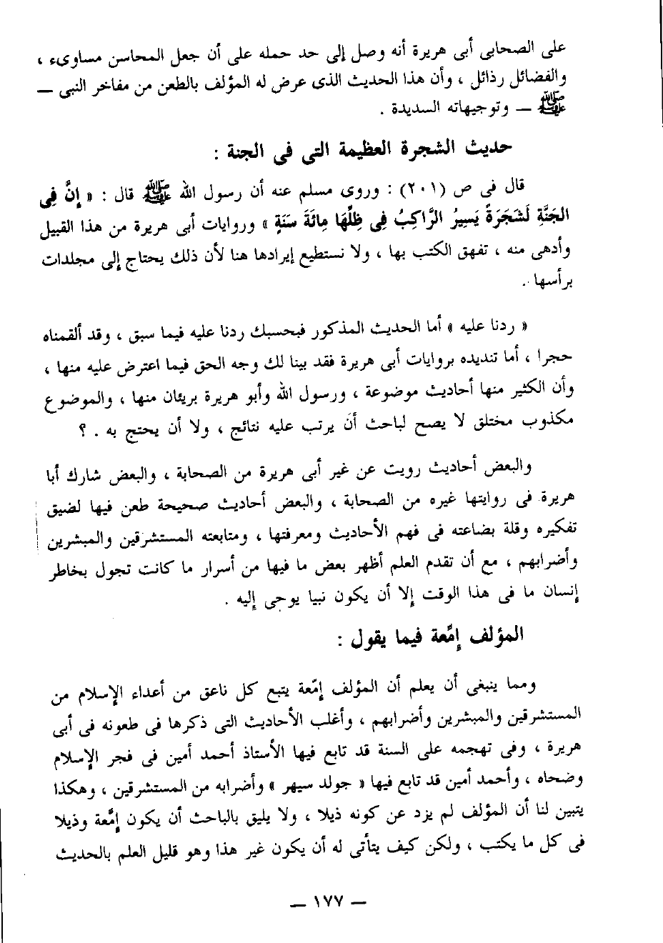 قال في [ص 201]: وروى " مسلم " عنه أنَّ رَسُولَ اللهِ - صَلََّى اللهُ عَلَيْهِ وَسَلَّمَ - قَالَ: «إِنَّ فِي الجَنَّةِ لَشَجَرَةً يَسِيرُ الرَّاكِبُ فِي ظِلِّهَا مِائَةَ سَنَةٍ» وروايات أبي هريرة من هذا القبيل وأدهى منه، تفهق الكتب بها، ولا نستطيع إيرادها هنا لأن ذلك يحتاج إلى مجلدات برأسها.