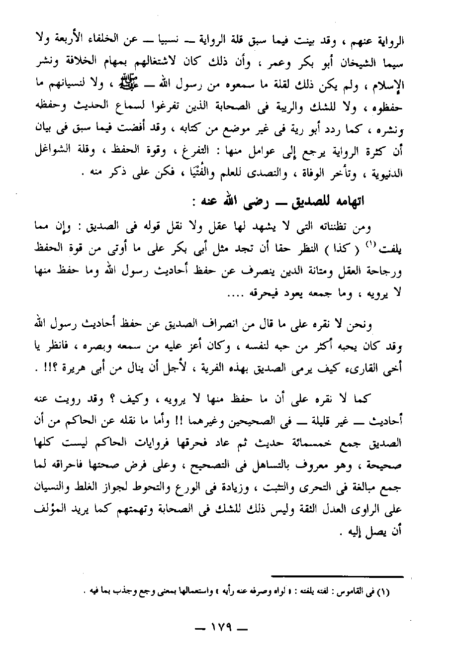 الرواية عنهم، وقد بَيَّنْتُ فيما سبق قلة الرواية - نِسْبِيًّا - عن الخلفاء الأربعة ولا سيما الشيخان أبو بكر وعمر، وأن ذلك كان لاشتغالهم بمهام الخلافة ونشر الإسلام، ولم يكن ذلك لقلة ما سمعوه من رسول الله - صَلََّى اللهُ عَلَيْهِ وَسَلَّمَ -، ولا لنسيانهم ما حفظوه، ولا للشك والريبة في الصحابة الذين تفرغوا لسماع الحديث وحفظه ونشره، كَمَا رَدَّدَ أَبُو رَيَّةَ في غير موضع من كتابه، وقد أفضت فيما سبق في بيان أن كثرة الرواية يرجع إلى عوامل منها: التفرغ، وقوة الحفظ، وقلة الشواغل الدنيوية، وتأخر الوفاة، والتصدي للعلم والفتيا، فكن على ذكر منه.