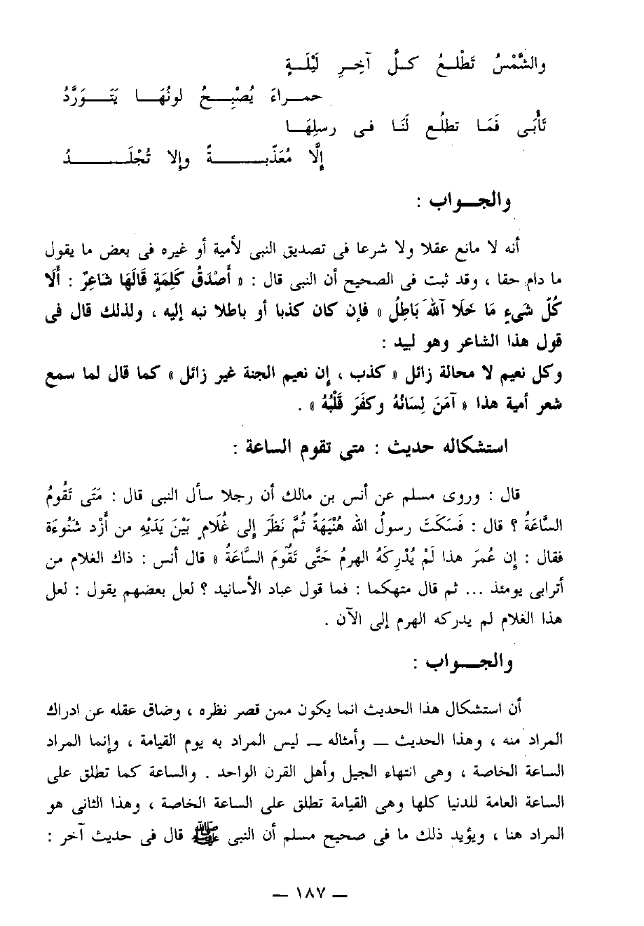 قَالَ: وَرَوَى " مسلم " عَنْ أَنَسِ بْنِ مَالِكٍ، أَنَّ رَجُلاً سَأَلَ النَّبِيَّ صَلَّى اللهُ عَلَيْهِ وَسَلَّمَ، قَالَ: مَتَى تَقُومُ السَّاعَةُ؟ قَالَ: فَسَكَتَ رَسُولُ اللهِ صَلَّى اللهُ عَلَيْهِ وَسَلَّمَ هُنَيْهَةً، ثُمَّ نَظَرَ إِلَى غُلاَمٍ بَيْنَ يَدَيْهِ مِنْ أَزْدِ شَنُوءَةَ، فَقَالَ: «إِنْ عُمِّرَ هَذَا، لَمْ يُدْرِكْهُ الْهَرَمُ حَتَّى تَقُومَ السَّاعَةُ» قَالَ: قَالَ أَنَسٌ: ذَاكَ الْغُلاَمُ مِنْ أَتْرَابِي يَوْمَئِذٍ ... ثم قال متهكما: فما قول عُبَّادِ الأسانيد؟ لعل بعضهم يقول: لعل هذا الغلام لم يدركه الهرم إلى الآن.