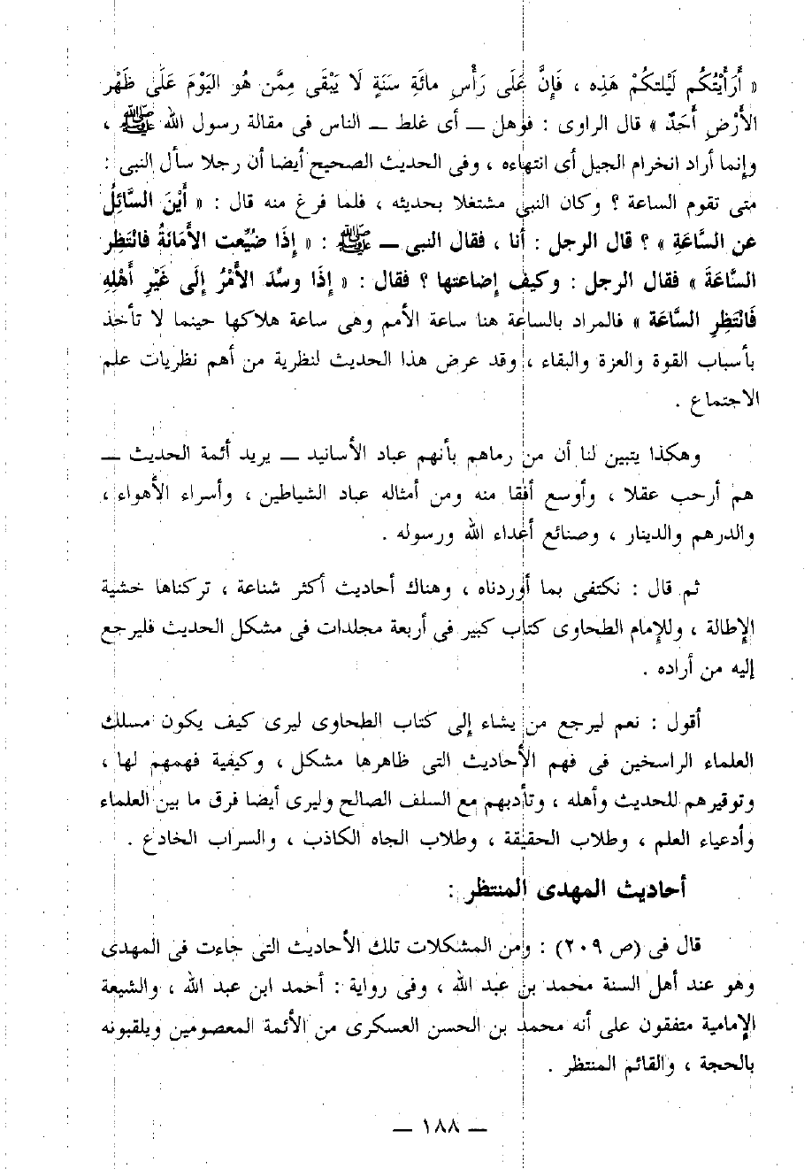 «أَرَأَيْتَكُمْ لَيْلَتَكُمْ هَذِهِ؟ فَإِنَّ عَلَى رَأْسِ مِائَةِ سَنَةٍ مِنْهَا لاَ يَبْقَى مِمَّنْ هُوَ عَلَى ظَهْرِ الأَرْضِ أَحَدٌ» قَالَ [ابْنُ عُمَرَ]: فَوَهَلَ النَّاسُ - أي غلط - فِي مَقَالَةِ رَسُولِ اللهِ - صَلَّى اللهُ عَلَيْهِ وَسَلَّمَ - وإنما أراد انخرام الجيل أي انتهاءه، وفي الحديث الصحيح اَيْضًا أن رجلا سأل النَّبِي: متى تقوم الساعة؟ وكان النَّبِي مشتغلا بحديثه، فلما فرغ منه قال: «أَيْنَ السَّائِلُ عَنِ السَّاعَةِ؟» قَالَ الرَّجُلُ: أَنَا، فَقَالَ النَّبِيُّ - صَلََّى اللهُ عَلَيْهِ وَسَلَّمَ -: «إِذَا ضُيِّعَتِ الأَمَانَةُ، فَانْتَظِرِ السَّاعَةَ» فَقَالَ الرَّجُلُ: وَكَيْفَ إِضَاعَتُهَا؟ فَقَالَ: «إِذَا وُسَّدَ الأَمْرَ إِلَى غَيْرِ أَهْلِهِ، فَانْتَظِرِ السَّاعَةَ». فالمراد بالساعة هنا ساعة الأمم وهي ساعة هلاكها حينما لا تأخذ بأسباب القوة والعزة والبقاء، وقد عرض هذا الحديث لِنَظَرِيَّةٍَ من أهم نظريات علم الاجتماع وهكذا يَتَبَيَّن لنا أن من رماهم بأنهم عُبَّادُ الأَسَانِيدِ - يريد أئمة الحديث - هم أرحب عقلاً، وأوسع أُفُقًا منه ومن أمثاله عُبَّادُ الشَّيَاطِينِ، وأسراء الأهواء، والدرهم والدينار، وصنائع أعداء الله ورسوله.
