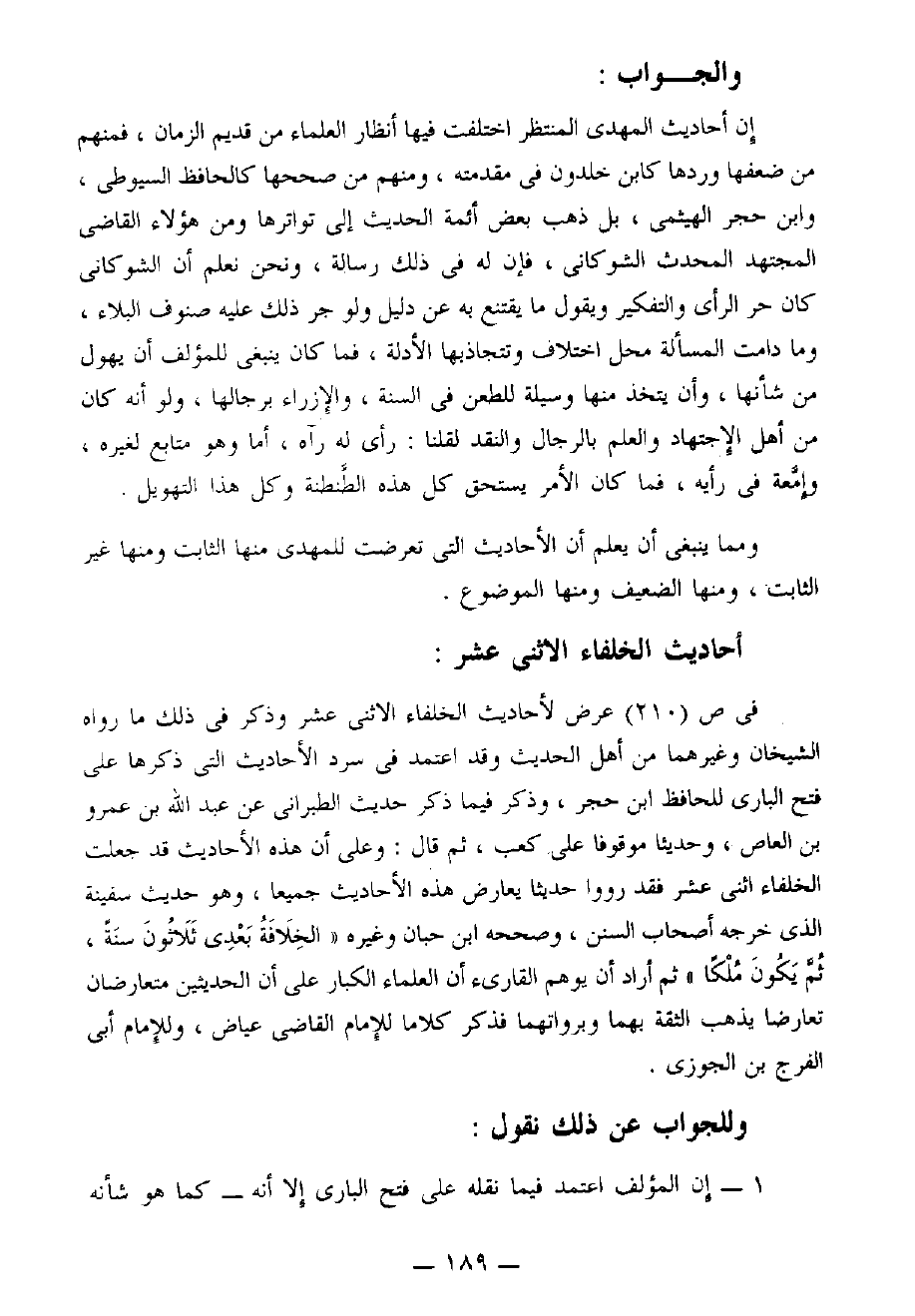 في [ص 210] عرض لأحاديث الخلفاء الاثني عشر وذكر في ذلك ما رواه الشيخان وغيرهما من أهل الحديث وقد اعتمد في سرد الأحاديث التي ذكرها على " فتح الباري " للحافظ ابن حجر، وذكر فيما ذكر حديث " الطبراني " عن عبد الله بن عمرو بن العاص، وحديثًا موقوفًا على كعب، ثم قال: وعلى أن هذه الأحاديث قد جعلت الخلفاء اثني عشر فقد رَوَوْا حَدِيثًا يعارض هذه الأحاديث جميعًا، وهو حديث سَفِينَةَ الذي خرجه أصحاب السنن، وَصَحَّحَهُ ابن حبان وغيره «الخِلاَفَةُ بَعْدِي ثَلاَثُونَ سَنَةً ثُمَّ يَكُونُ مُلْكًا» ثم أراد أن يوهم القارئ أن العلماء الكبار على أن الحديثين متعارضان تعارضًا يذهب الثقة بهما وبرواتهما فذكر كلاما للإمام القاضي عياض، وللإمام أبي الفرج بن الجوزي.