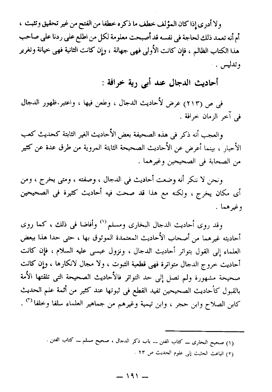 في [ص 213] عرض لأحاديث الدَجَّالِ، وطعن فيها، واعتبر ظهور الدجال في آخر الزمان خرافة. والعجب أنه ذكر في هذه الصحيفة بعض الأحاديث الغير ثابتة كحديث كعب الأحبار، بينما أعرض عن الأحاديث الصحيحة الثابتة المروية من طرق عدة عن كثير من الصحابة في " الصحيحين " وغيرهما.