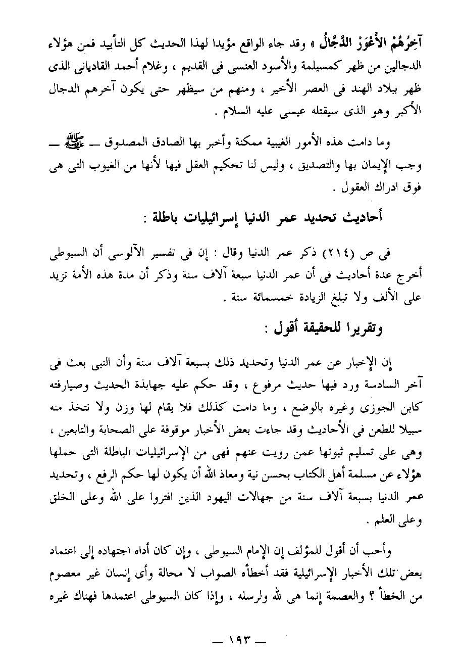 وأحب أن أقول للمؤلف إن الإمام السيوطي، وإن كان أداه اجتهاده إلى اعتماد بعض تلك الأخبار الإسرائيلية فقد أخطأه الصواب لا محالة وأي إنسان غير معصوم من الخطأ؟ والعصمة إنما هي للهِ ولرسله، وإذا كان السيوطي اعتمدها فهناك غيره