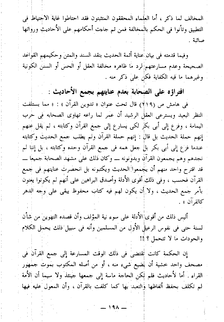 في [هامش ص 219] قال تحت عنوان «تدوين القرآن»: «مِمَّا يستلفت النظر البعيد ويسترعي العقل الرشيد أن عمر لما راعه تهاوي الصحابة في حرب اليمامة، وفزع إلى أبي بكر لكي يسارع إلى جمع القرآن وكتابته، لم يقل عنهم إنهم حَمَلَةُ الحديث بل قال: إنهم حَمَلَةُ القرآن ولم يطلب جمع الحديث وكتابته عندما فزع إلى أبي بكر بل جعل هَمَّهُ في جمع القرآن وحده وكتابته، بل إننا لم نجدهم وهم يجمعون القرآن ويدونونه - وكان ذلك على مشهد الصحابة جميعًا - قد اقترح واحد منهم أن يجمعوا الحديث ويكتبونه بل انحصرت عنايتهم في جمع القرآن فحسب، وفي ذلك أقوى الأدلة وأصدق البراهين على أنهم لم يكونوا يعنون بأمر جمع الحديث، ولا أن يكون لهم فيه كتاب محفوظ يبقى على وجه الدهر كالقرآن».