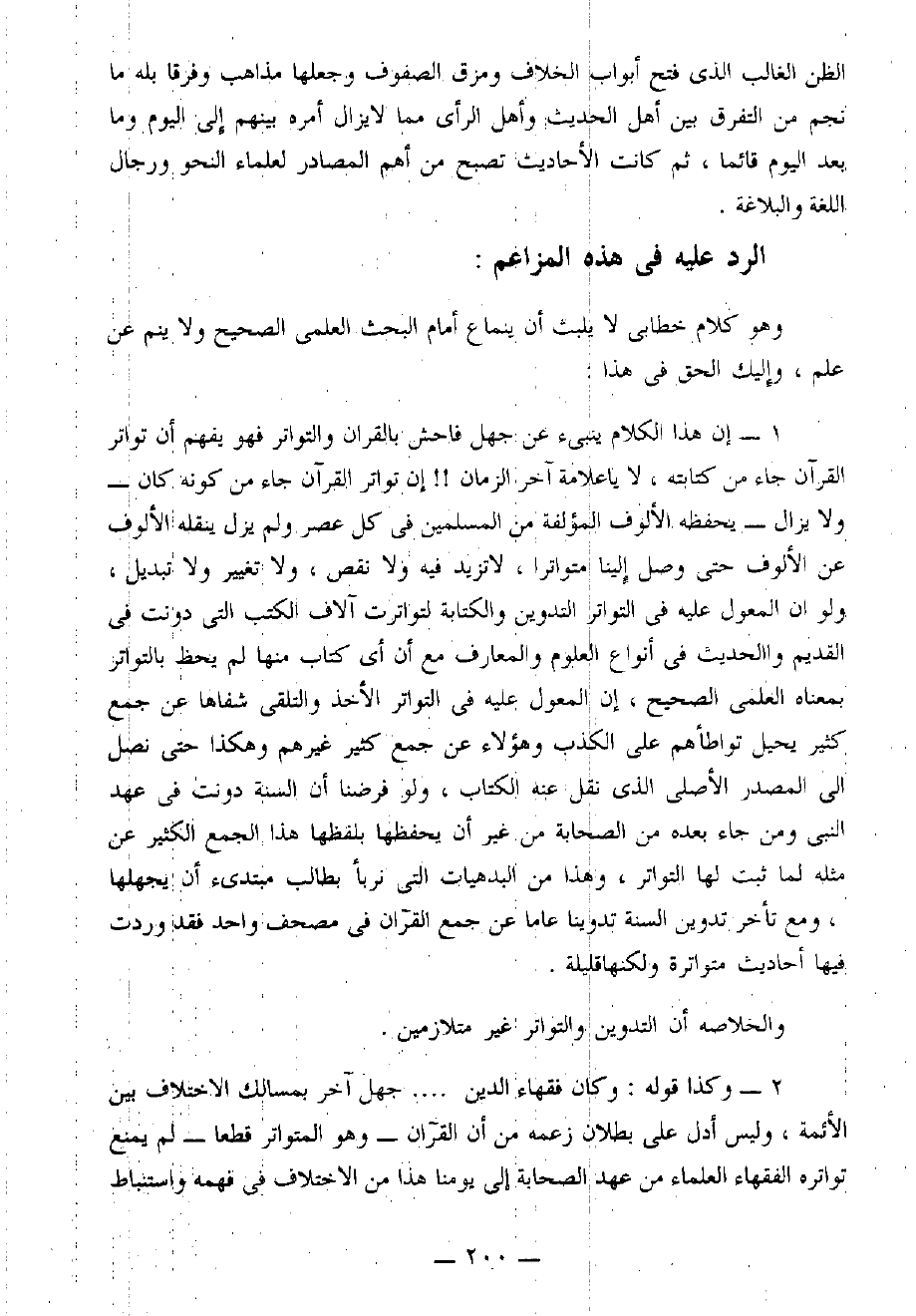 1 - إن هذا الكلام ينبئ عن جهل فاحش بالقرآن والتواتر فهو يفهم أن تواتر القرآن جاء من كتابته، لاَ يَا عَلاَّمَةَ آخِرَ الزَّمَانِ!! إن تواتر القرآن جاء من كونه كان - ولا يزال - يحفظه الألوف المُؤَلَّفَةِ من المسلمين في كل عصر ولم يزل ينقله الألوف عن الألوف حتى وصل إلينا متواترًا، لا تزيد فيه ولا نقص، ولا تغيير ولا تبديل، ولو أن المُعَوَّلَ عَلَيْهِ في التواتر التدوين والكتابة لتواترت آلاف الكتب التي دونت في القديم والحديث في أنواع العلوم والمعارف مع أن أي كتاب منها لم يحظ بالتواتر بمعناه العلمي الصحيح، إن المُعَوَّلَ عَلَيْهِ في التواتر الأخذ والتلقي شفاهًا عن جمع كثير يستحيل تواطأهم على الكذب وهؤلاء عن جمع كثير غيرهم وهكذا حتى نصل إلى المصدر الأصلي الذي نقل عنه الكتاب، ولو فرضنا أن السُنَّةَ دُوِّنَتْ في عهد النَّبِيِّ ومن جاء بعده من الصحابة من غير أن يحفظها بلفظها هذا الجمع الكثير عن مثله لما ثبت لها التواتر، وهذا من البدهيات التي نربأ بطالب مبتدئ أن يجهلها، ومع تأخر تدوين السُنَّةِ تَدْوِينًا عَامًّا عن جمع القرآن في مصحف واحد فقد وردت فيها أحاديث متواترة ولكنها قليلة.