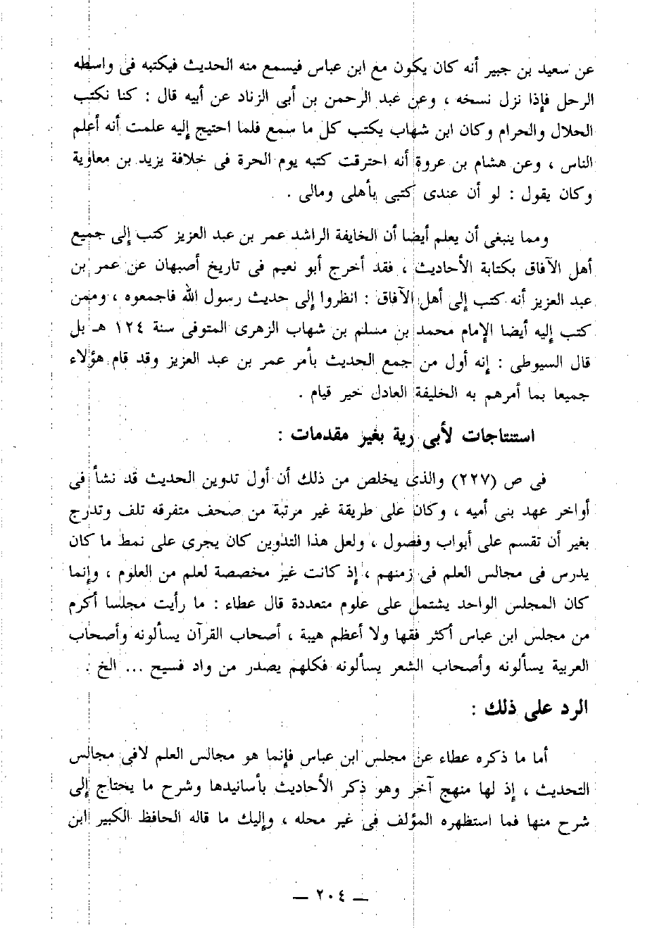 في [ص 227] والذي يخلص من ذلك أن أول تدوين الحديث قد نشأ في أواخر عهد بني أمية، وكان على طريقة غير مرتبة من صحف متفرقة تلف وتدرج بغير أن تقسم على أبواب وفصول، ولعل هذا التدوين كان يجري على نمط ما كان يدرس في مجالس العلم في زمنهم، إذ كانت غير مخصصة لعلم من العلوم، وإنما كان المجلس الواحد يشتمل على علوم متعددة قال عطاء: ما رأيت مجلسا أكرم من مجلس ابن عباس أكثر فقها ولا أعظم هيبة، أصحاب القرآن يسألونه وأصحاب العربية يسألونه وأصحاب الشعر يسألونه فكلهم يصدر من واد فسيح ... إلخ.
