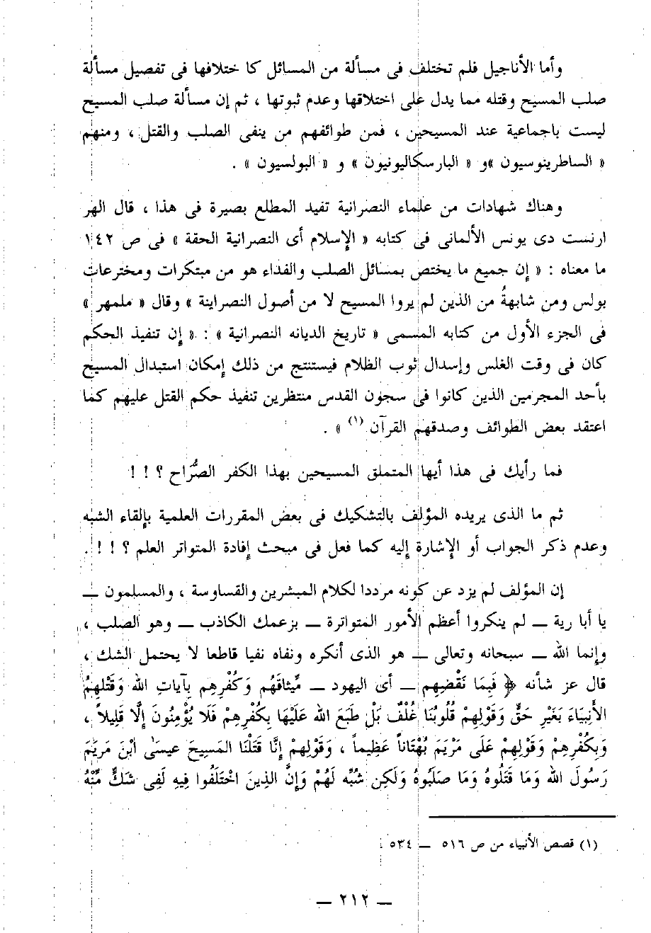 إن المؤلف لم يزد عن كونه مُرَدِّدًا لكلام المُبَشِّرِينَ والقساوسة، والمسلمون - يَا أَبَا رَيَّةَ - لم ينكروا أعظم الأمور المتواترة - بزعمك الكاذب - وهو الصلب، وإنما الله - سُبْحَانَهُ وَتَعَالَى - هو الذي أنكره ونفاه نفيًا قاطعًا لا يحتمل الشك، قال - عَزَّ شَأْنُهُ -: {فَبِمَا نَقْضِهِمْ} - أي اليهود - {مِيثَاقَهُمْ وَكُفْرِهِمْ بِآيَاتِ اللَّهِ وَقَتْلِهِمُ الأَنْبِيَاءَ بِغَيْرِ حَقٍّ وَقَوْلِهِمْ قُلُوبُنَا غُلْفٌ بَلْ طَبَعَ اللَّهُ عَلَيْهَا بِكُفْرِهِمْ فَلاَ يُؤْمِنُونَ إِلاَّ قَلِيلاً، وَبِكُفْرِهِمْ وَقَوْلِهِمْ عَلَى مَرْيَمَ بُهْتَانًا عَظِيمًا} (¬2).