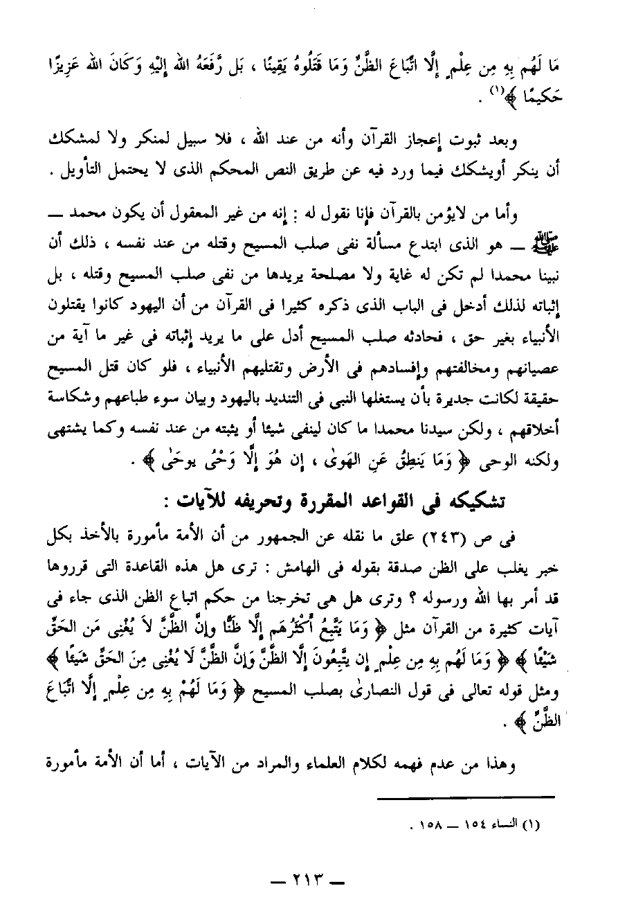 في [ص 243] علق ما نقله عن الجمهور من أن الأُمَّة مأمورة بالأخذ بكل خبر يغلب على الظن صدقه بقوله في الهامش: ترى هل هذه القاعدة التي قرروها قد أمر بها الله ورسوله؟ وترى هل هي تخرجنا من حكم اتباع الظن الذي جاء في آيات كثيرة من القرآن مثل {وَمَا يَتَّبِعُ أَكْثَرُهُمْ إِلاَّ ظَنًّا إِنَّ الظَّنَّ لاَ يُغْنِي مِنَ الحَقِّ شَيْئًا} (¬3) {وَمَا لَهُمْ بِهِ مِنْ عِلْمٍ إِنْ يَتَّبِعُونَ إِلاَّ الظَّنَّ وَإِنَّ الظَّنَّ لاَ يُغْنِي مِنَ الْحَقِّ شَيْئًا} (¬4) ومثل قوله تعالى في قول النصارى بصلب المسيح {وَمَا لَهُمْ بِهِ مِنْ عِلْمٍ إِنْ يَتَّبِعُونَ إِلاَّ الظَّنَّ} (¬5).
