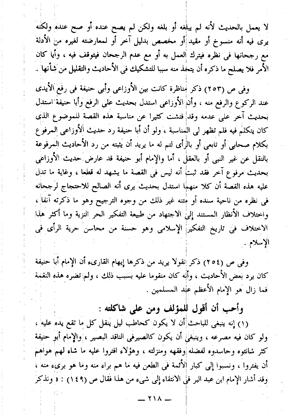 وفي [ص 253] ذكر مناظرة كانت بين الأوزاعي وأبي حنيفة في رفع الأيدي عند الركوع والرفع منه، وأن الأوزاعي استدل بحديث على الرفع وأبا حنيفة استدل بحديث آخر على عدمه وقد فتشت كثيرًا عن مناسبة هذه القصة للموضوع الذي كان يتكلم فيه فلم تظهر لي المناسبة، ولو أن أبا حنيفة رَدَّ حديث الأوزاعي المرفوع بكلام صحابي أو تابعي أو بالرأي لتم له ما يريد أن يثبته من رد الأحاديث المرفوعة بالنقل عن غير النَّبِيِّ أو بالعقل، أما والإمام أبو حنيفة قد عارض حديث الأوزاعي بحديث مرفوع آخر فقد ثبت أنه ليس في القصة ما يشهد له قَطْعًا، وغاية ما تدل عليه هذه القصة أن كُلاًّ منهما استدل بحديث يرى أنه الصالح للاحتجاج لرجحانه في نظره من ناحية سنده أو متنه غير ذلك من وجوه الترجيح وهو ما ذكرته آنِفًا، واختلاف الأنظار المستند إلى الاجتهاد من طبيعة التفكير الحر النزيه وما أكثر هذا الاختلاف في تاريخ التفكير الإسلامي وهو حسنة من محاسن حرِيَّةَ الرأي في الإسلام.