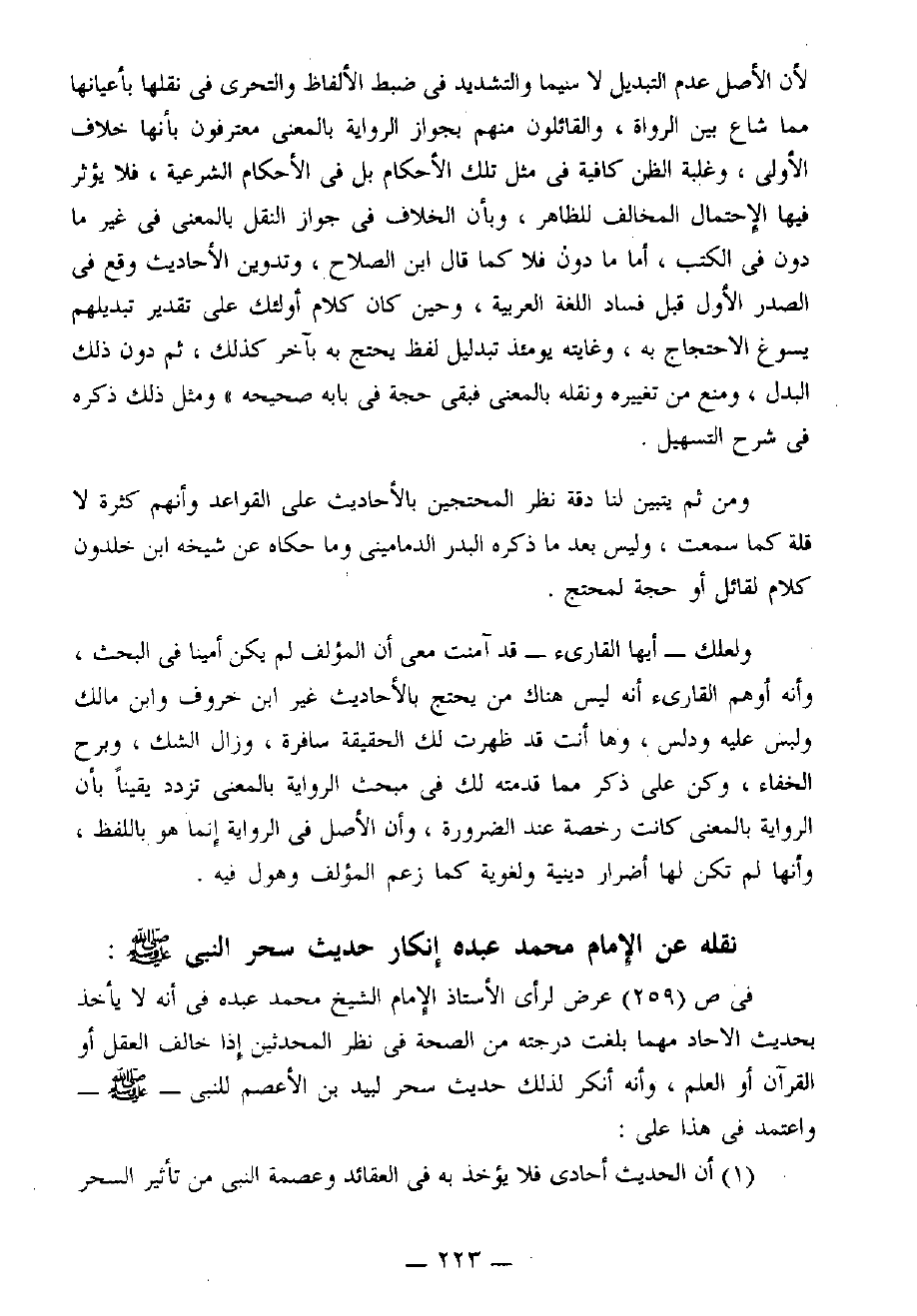 في [ص 259] عرض لرأي الأستاذ الإمام الشيخ محمد عبده في أنه لا يأخذ بحديث الآحاد مهما بلغت درجته من الصحة في نظر المُحَدِّثِينَ إذا خالف العقل أو القرآن أو العلم، وأنه أنكر لذلك حديث سحر لبيد بن الأعصم لِلْنَّبِيِّ - صَلََّى اللهُ عَلَيْهِ وَسَلَّمَ - واعتمد في هذا على: