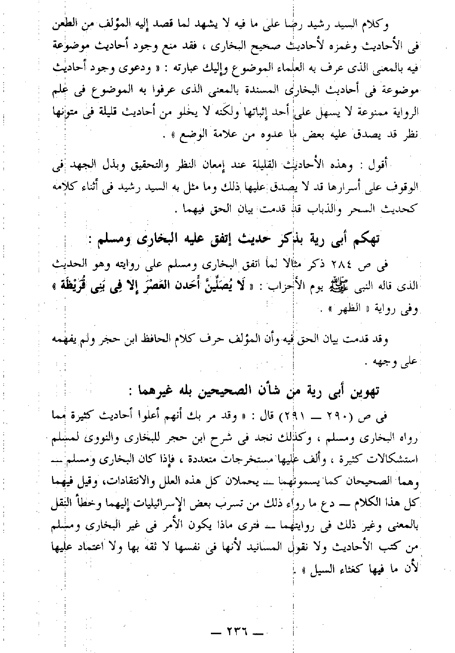 في [ص 290 - 291] قال: «وقد مر بك أنهم أعلوا أحاديث كثيرة مِمَّا رواه " البخاري " و " مسلم "، وكذلك نجد في " شرح ابن حجر للبخاري " و" النووي لمسلم " استشكالات كثيرة، وألف عليها مستخرجات متعددة، فإذا كان البخاري ومسلم - وهما " الصحيحان " كما يسمونهما - يحملان كل هذه العلل والانتقادات، وقيل فيهما كل هذا الكلام - دع ما وراء ذلك من تسرب بعض الإسرائيليات إليهما وخطأ النقل بالمعنى وغير ذلك في روايتهما - فترى ماذا يكون الأمر في غير " البخاري " و " مسلم " من كتب الأحاديث ولا نقول المسانيد لأنها في نفسها لا ثقة بها ولا اعتماد عليها لأن ما فيها كغثاء السيل».