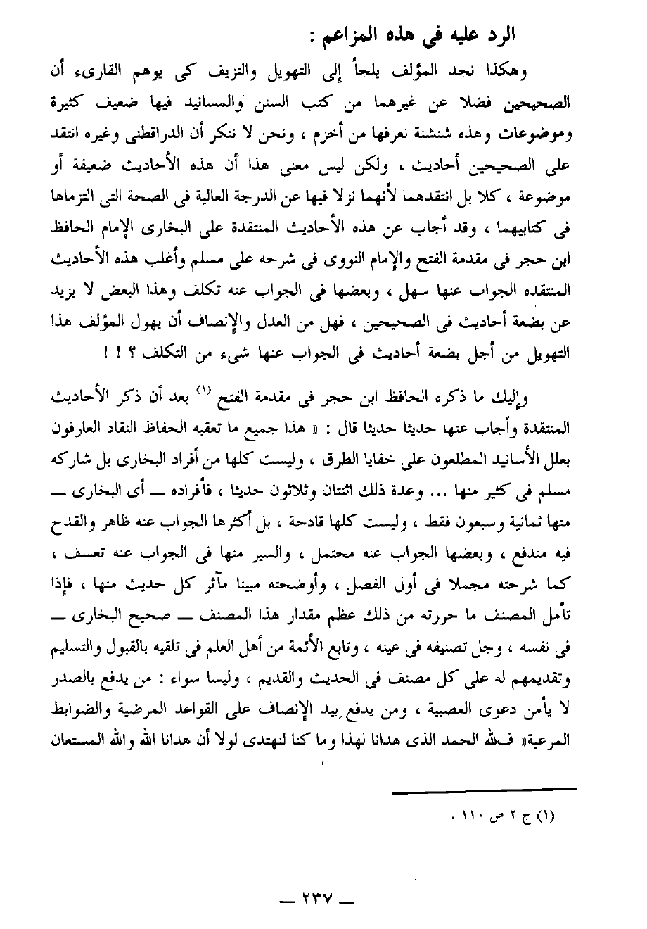 عن الدرجة العالية في الصحة التي التزماها في كتابيهما، وقد أجاب عن هذه الأحاديث المنتقدة على البخاري الإمام الحافظ ابن حجر في مقدمة " الفتح " والإمام النووي في " شرحه على مسلم " وأغلب هذه الأحاديث المنتقدة الجواب عنها سهل، وبعضها في الجواب عنه تكلف وهذا البعض لا يزيد عن بضعة أحاديث في " الصحيحين "، فهل من العدل والإنصاف أن يهول المؤلف هذا التهويل من أجل بضعة أحاديث في الجواب عنها شيء من التكلف؟!!