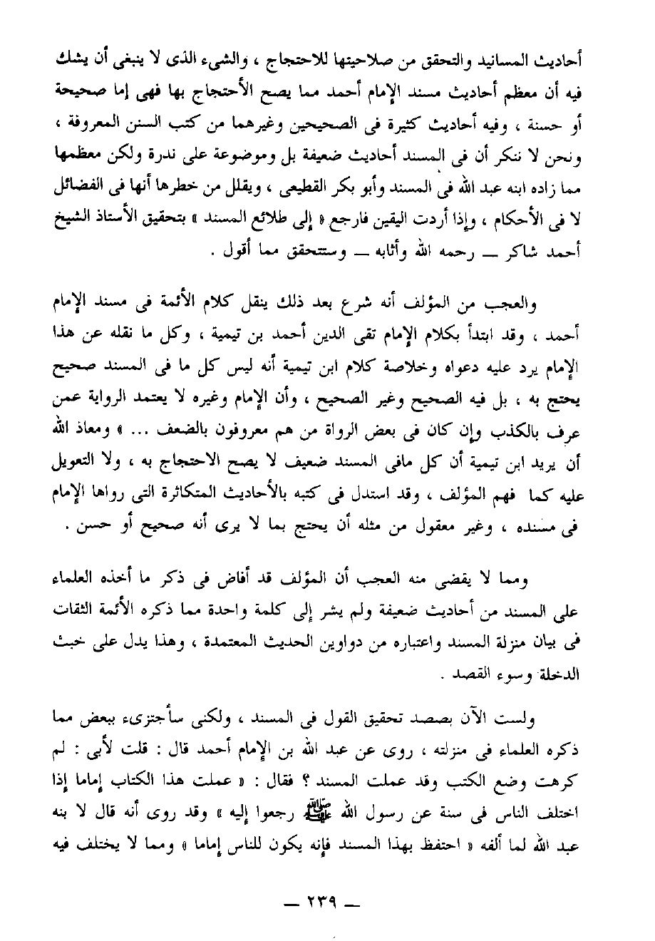 والعجب من المؤلف أنه شرع بعد ذلك ينقل كلام الأئمة في " مسند الإمام أحمد "، وقد ابتدأ بكلام الإمام تقي الدين أحمد بن تيمية، وكل ما نقله عن هذا الإمام يَرُدُّ عليه دعواه وخلاصة كلام ابن تيمية أنه ليس كل ما في " المسند " صحيح يحتج به، بل فيه الصحيح وغير الصحيح، وأن الإمام وغيره لا يعتمد الرواية عمن عرف بالكذب وإن كان في بعض الرواة من هم معروفون بالضعف .... » ومعاذ الله أن يريد ابن تيمية أن كل ما في " المسند " ضعيف لا يصح الاحتجاج به، ولا التعويل عليه كما فهم المؤلف، وقد استدل في كتبه بالأحاديث المتكاثرة التي رواها الإمام في " مسنده "، وغير معقول من مثله أن يحتج بما لا يرى أنه صحيح أو حسن.