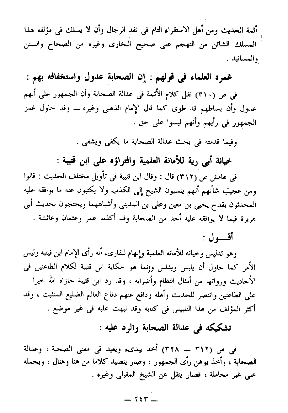في [ص 312 - 328] أخذ يبدئ ويعيد في معنى الصحبة، وعدالة الصحابة، وأخذ يوهن رأي الجمهور، وصار يتصيد كلامًا من هنا وهناك، ويحمله على غير محامله، فصار ينقل عن الشيخ المقبلي وغيره.