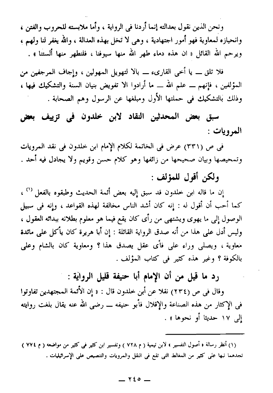 في [ص 331] عرض في الخاتمة لكلام الإمام ابن خلدون في نقد المرويات وتمحيصها وبيان صحيحها من زائفها وهو كلام حسن وقويم ولا يجادل فيه أحد.