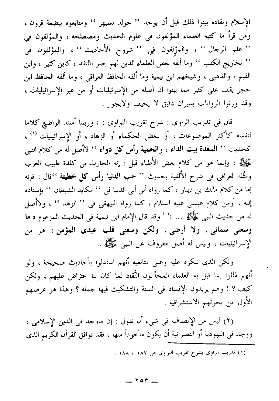 الإسلام ونقاده بينوا ذلك قبل أن يوجد " جولدتسيهر " ومتابعوه ببضعة قرون، ومن قرأ ما كتبه العلماء المؤلفون في علوم الحديث ومصطلحه، والمؤلفون في «علم الرجال»، والمؤلفون في " شروح الأحاديث "، والمؤلفون في " تخاريج الكتب " وما ألفه بعض العلماء الذين لهم بصر بالنقد، كابن كثير، وابن القيم، والذهبي، وشيخهم ابن تيمية وما ألفه الحافظ العراقي، وما ألفه الحافظ ابن حجر يقف على كثير مِمَّا بَيَّنُوا أن أصله من الإسرائيليات أو من غير الإسرائيليات، وقد وزنوا الروايات بميزان دقيق لا يحيف ولا يجور.