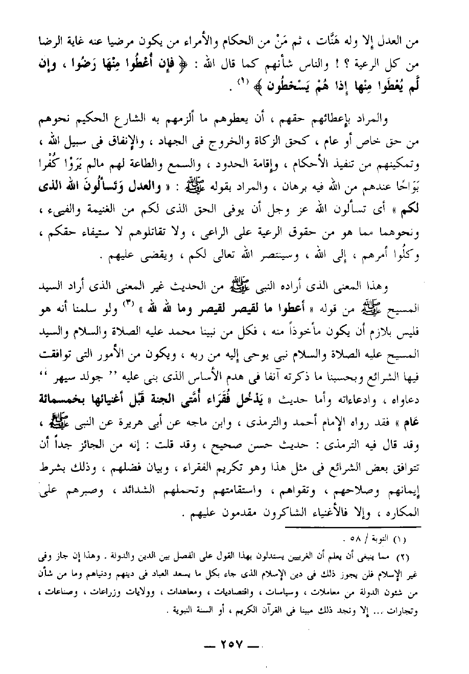 وهذا المعنى الذي أراده النبي - صَلََّى اللهُ عَلَيْهِ وَسَلَّمَ - من الحديث غير المعني الذي أراد السيد المسيح - صَلََّى اللهُ عَلَيْهِ وَسَلَّمَ - من قوله: «أُعْطُوا مَا لِقَيْصَرَ لِقَيْصَرَ، وَمَا للهِ للهِ» (¬2). ولو سلمنا أنه هو فليس بلازم أن يكون مأخوذا منه، فكل من نبينا محمد - عَلَيْهِ الصَلاَةُ وَالسَّلاَمُ - والسيد المسيح - عَلَيْهِ الصَلاَةُ وَالسَّلاَمُ - نبي يوحى إليه من ربه، ويكون من الأمور التي توافقت فيها الشرائع وبحسبنا ما ذكرته آنفا في هدم الأساس الذي بنى عليه " جولدتسيهر " دعاواه، وادعاءاته وأما حديث «يَدْخُلُ فُقَرَاءُ أُمَّتِي الْجَنَّةَ قَبْلَ أَغْنِيَائِهَا بِخَمْسِمِائَةِ عَامٍ» فقد رواه الإمام أحمد والترمذي، وابن ماجه عن أبي هريرة عن النبي - صَلََّى اللهُ عَلَيْهِ وَسَلَّمَ - وقد قال فيه الترمذي: حديث حسن صحيح، وقد قلت: إنه من الجائز جِدًّا أن تتوافق بعض الشرائع في مثل هذا وهو تكريم الفقراء، وبيان فضلهم، وذلك بشرط إيمانهم وصلاحهم، وتقواهم، واستقامتهم وتحملهم الشدائد، وصبرهم على المكاره، وإلا فالأغنياء الشاكرون مقدمون عليهم.