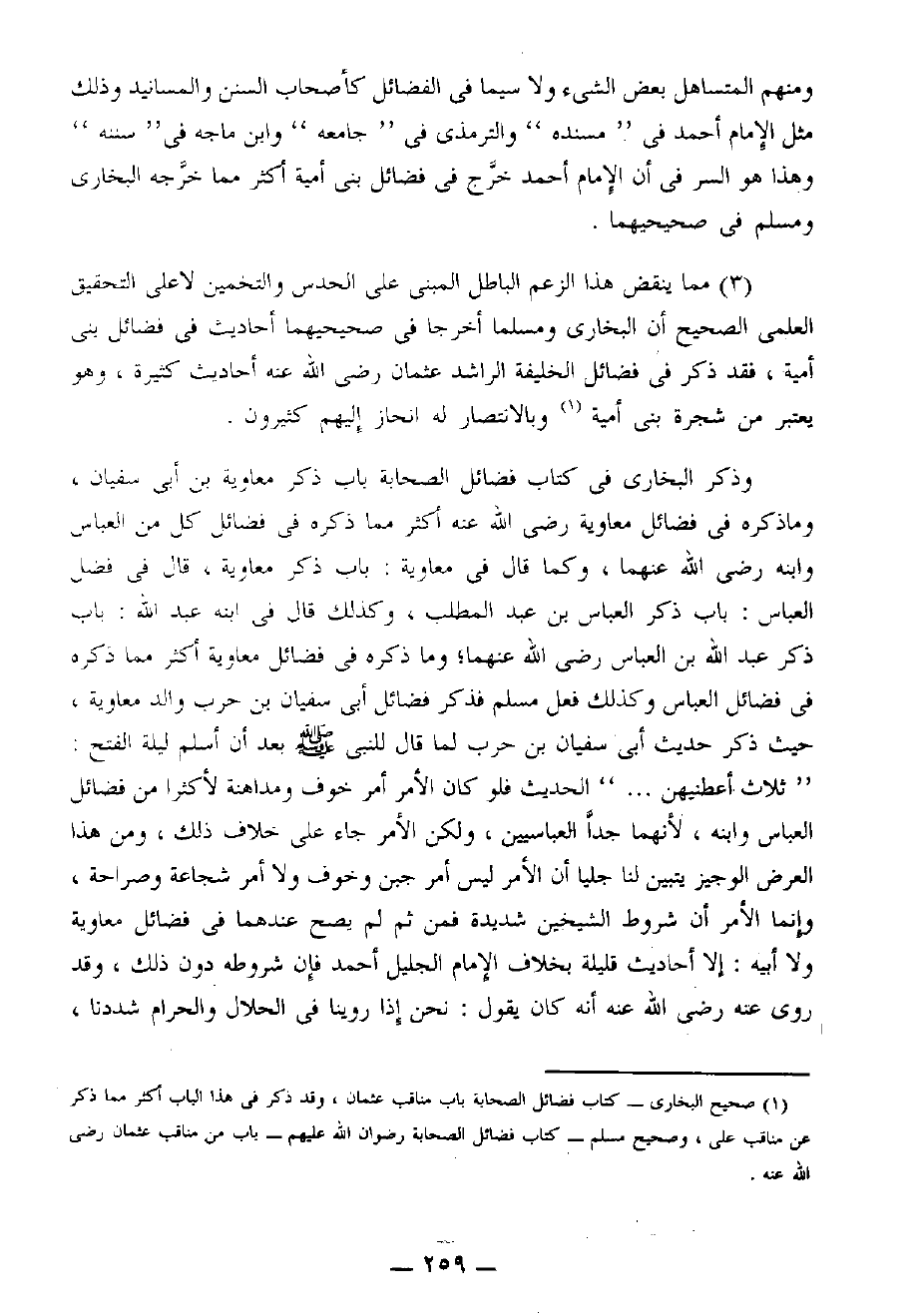 ومنهم المتساهل بعض الشيء ولا سيما في الفضائل كأصحاب السنن والمسانيد وذلك مثل الإمام أحمد في " مسنده " والترمذي في " جامعه " وابن ماجه " في سننه " وهذا هو السر في أن الإمام أحمد خرج في فضائل بني أمية أكثر مما خرجه البخاري ومسلم في " صحيحيهما ".