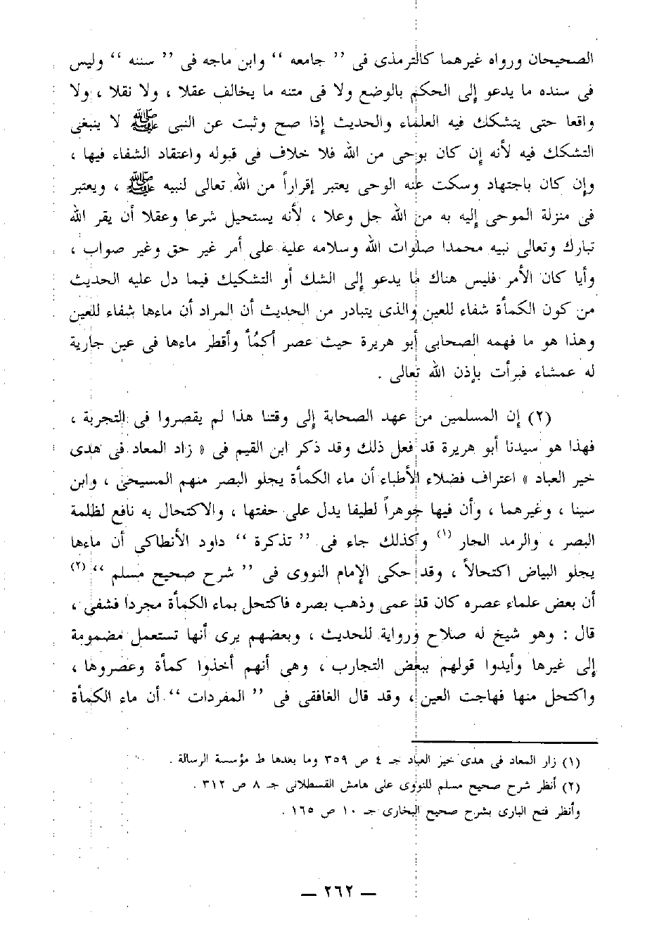 [2] إن المسلمين من عهد الصحابة إلى وقتنا هذا لم يقصروا في التجربة، فهذا هو سيدنا أبو هريرة قد فعل ذلك وقد ذكر ابن القيم في " زاد المعاد في هدي خير العباد " اعتراف فضلاء الأطباء أن ماء الكمأة يجلو البصر منهم المسيحي، وابن سينا، وغيرهما، وأن فيها جوهرًا لطيفًا يدل على حفتها، والاكتحال به نافع لظلمة البصر، والرمد الحار (¬1) وكذلك جاء في " تذكرة " داود الأنطاكي أن ماءها يجلو البياض اكتحالا، وقد حكى الإمام النووي في " شرح صحيح مسلم " (¬2) أن بعض علماء عصره كان قد عمي وذهب بصره فاكتحل بماء الكمأة مجردًا فشفي، قال: وهو شيخ له صلاح ورواية للحديث، وبعضهم يرى أنها تستعمل مضمومة إلى غيرها وأيدوا قولهم ببعض التجارب، وهي أنهم أخذوا كمأة وعصروها، واكتحل منها فهاجت العين، وقد قال الغافقي في " المفردات " أن ماء الكمأة